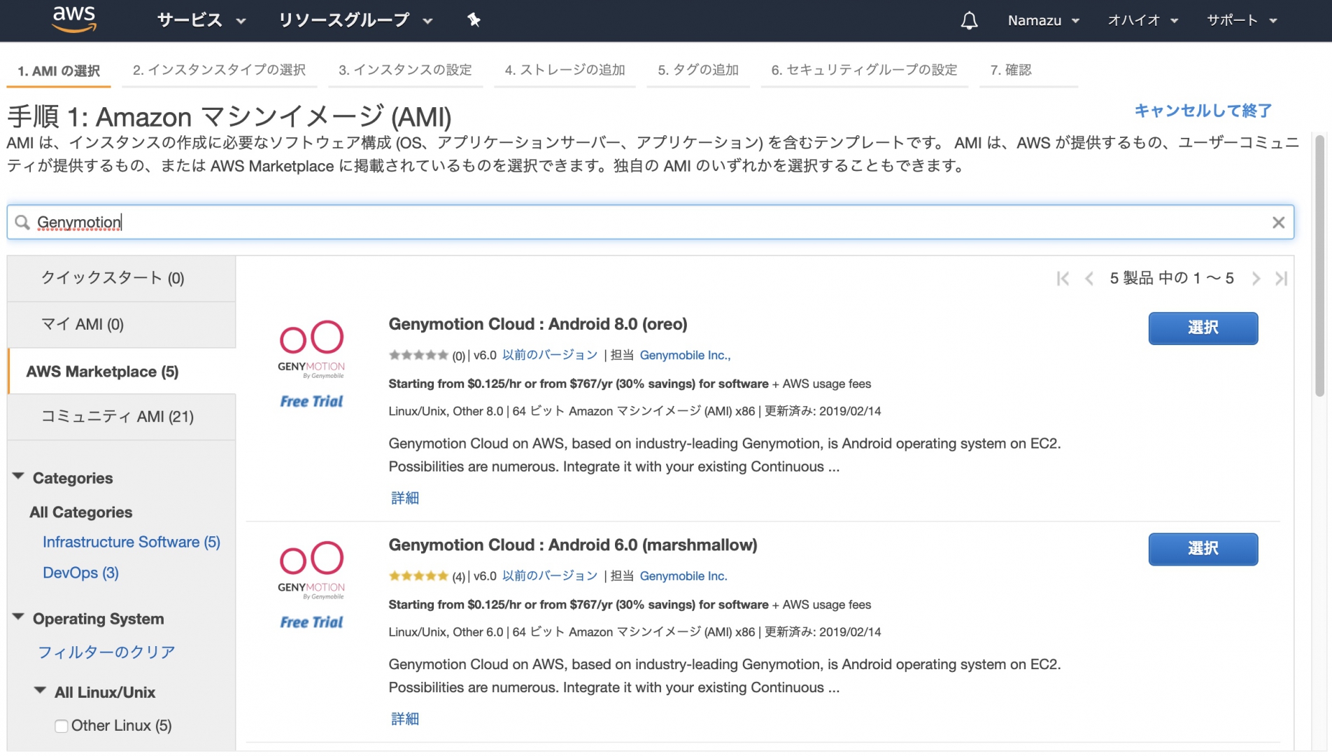 「Amazon Marketplace」を選択しGenymotionを検索します。