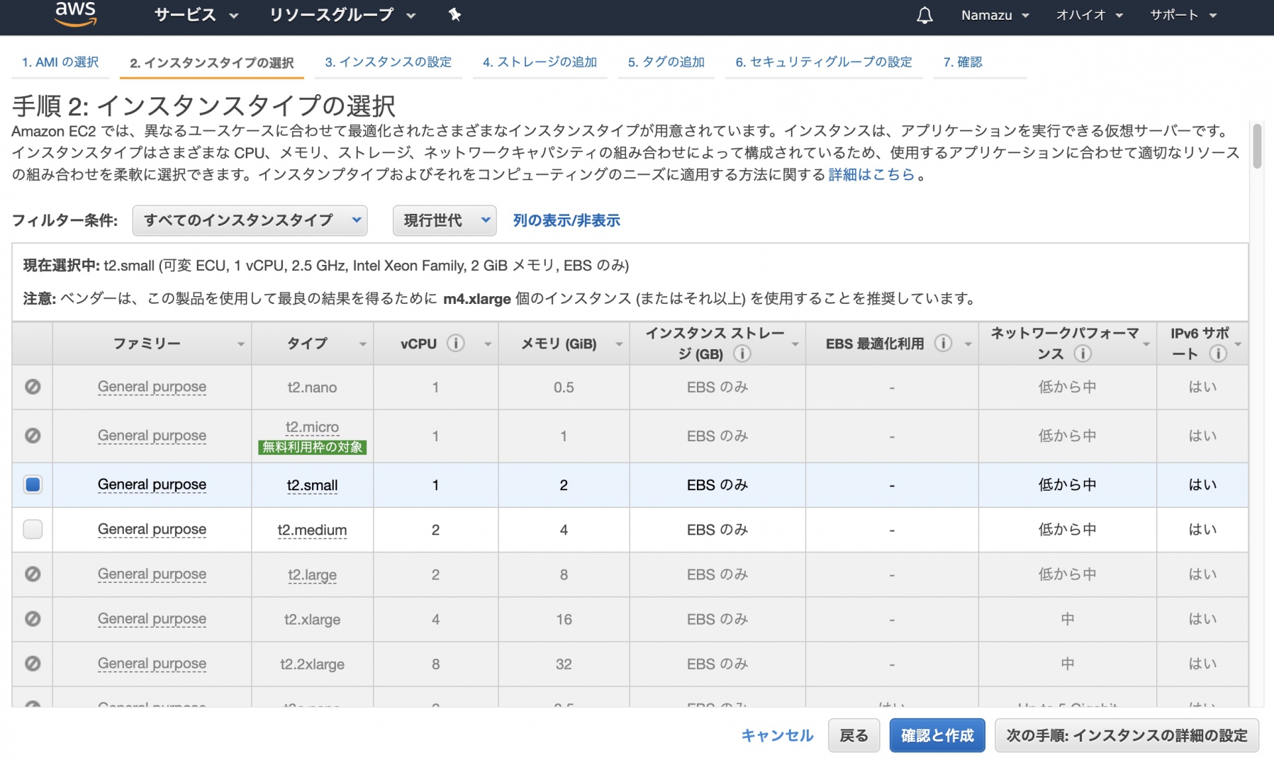 インスタンスを選びます。前述の通り最低スペックのt2.smallを選択。