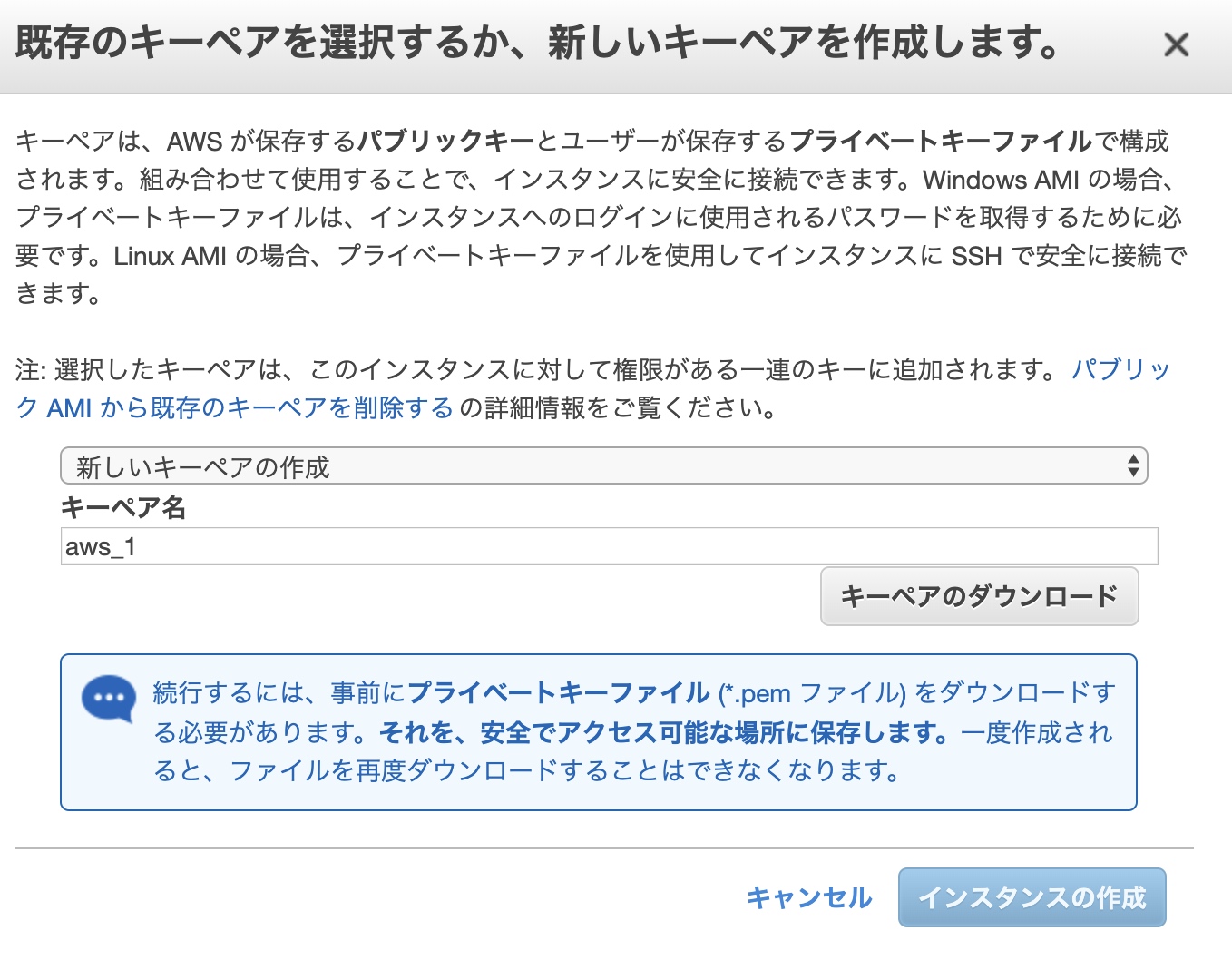 インスタンスの起動前に公開鍵認証の設定を要求されるので、初めての場合はキーペア作成をします。SSHでログインするときに使うので「キーペアをダウンロード」を忘れないように。(ダウンロードしないと先に進めない仕様ですが)