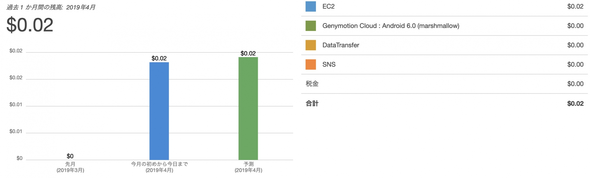 最後に2時間くらい使って下記料金でした。Genymotionが初めて使う場合数日間無料なので実質EC2代だけになっています。