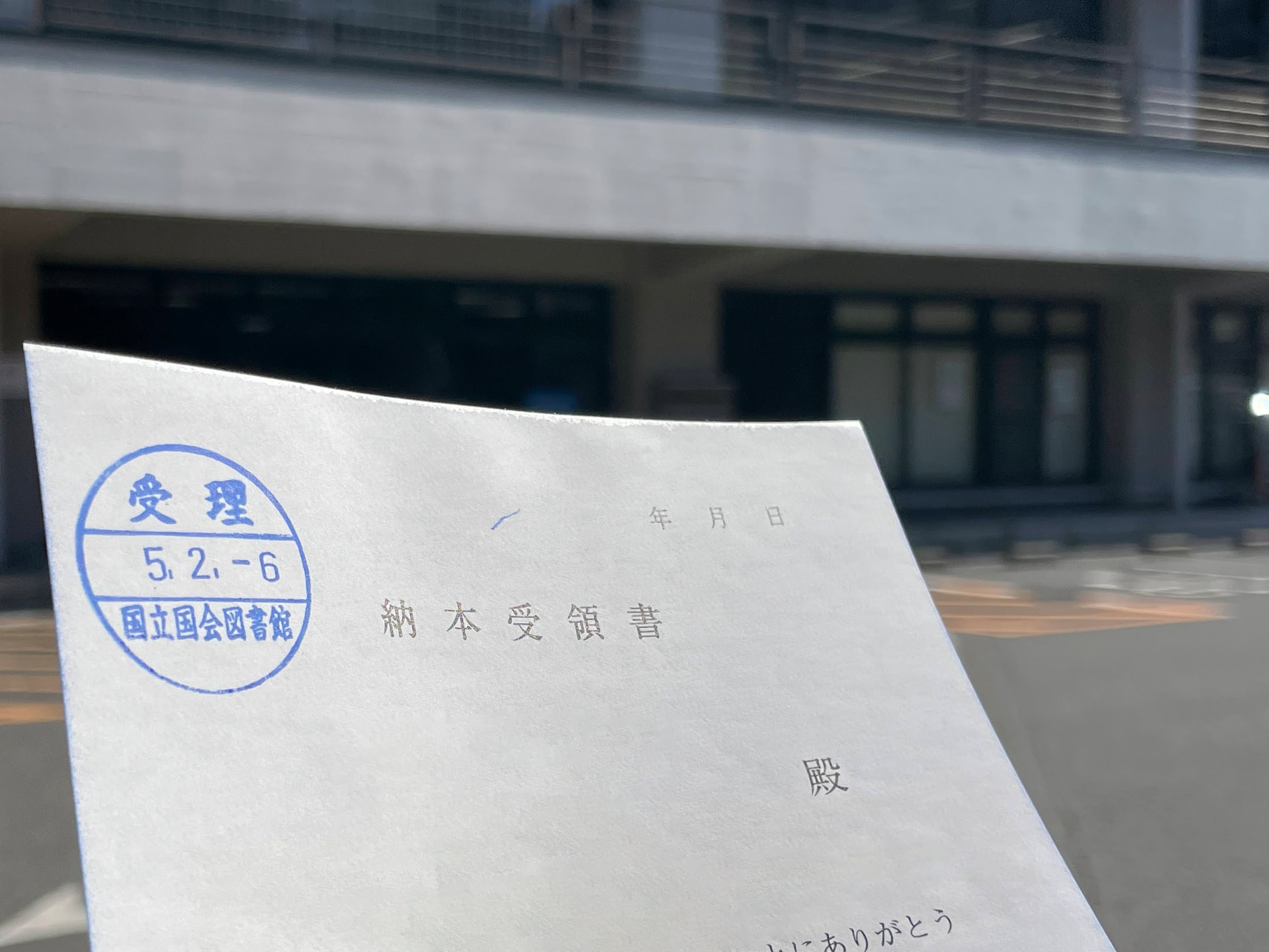 そして入館後、納本窓口で書籍を提出し受領書を貰って終了です。混んでなければ5分も掛からず終わります。