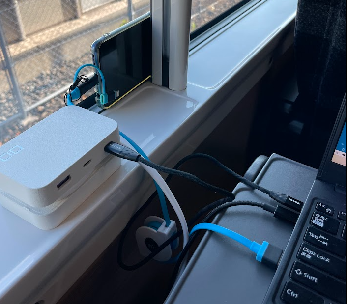 特急ひたちの車内で使用してみました。ひたちの車両はコンセントが使いやすい肘掛け部分にあるので従来のUSB-PD充電器を繋ぐのも不便ではありませんがこの製品であればより便利な位置に充電ポートを設置できます。