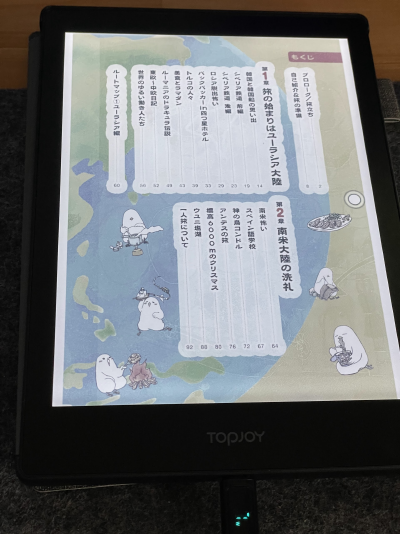 電子ペーパー端末らしく、電源を入れる前から画面が表示されています。これまで見たカラー電子ペーパー端末の中ではトップレベルで色が綺麗に出ていると感じました。