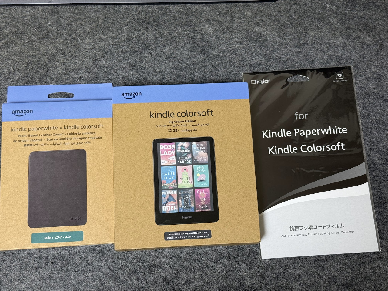 今回購入したものは、Kindle Colorsoftのシグネチャエディション、ケース、反射防止フィルムの3点です。標準モデルとシグネチャエディションの違いは、明るさの自動調整、ワイヤレス充電、ストレージ容量が倍の32GBの3点です。漫画を読まない方なら16GBの標準モデルでも良いかなと思います。(カラー表示版を買って漫画を読まない人は少数派な気もしますが)
