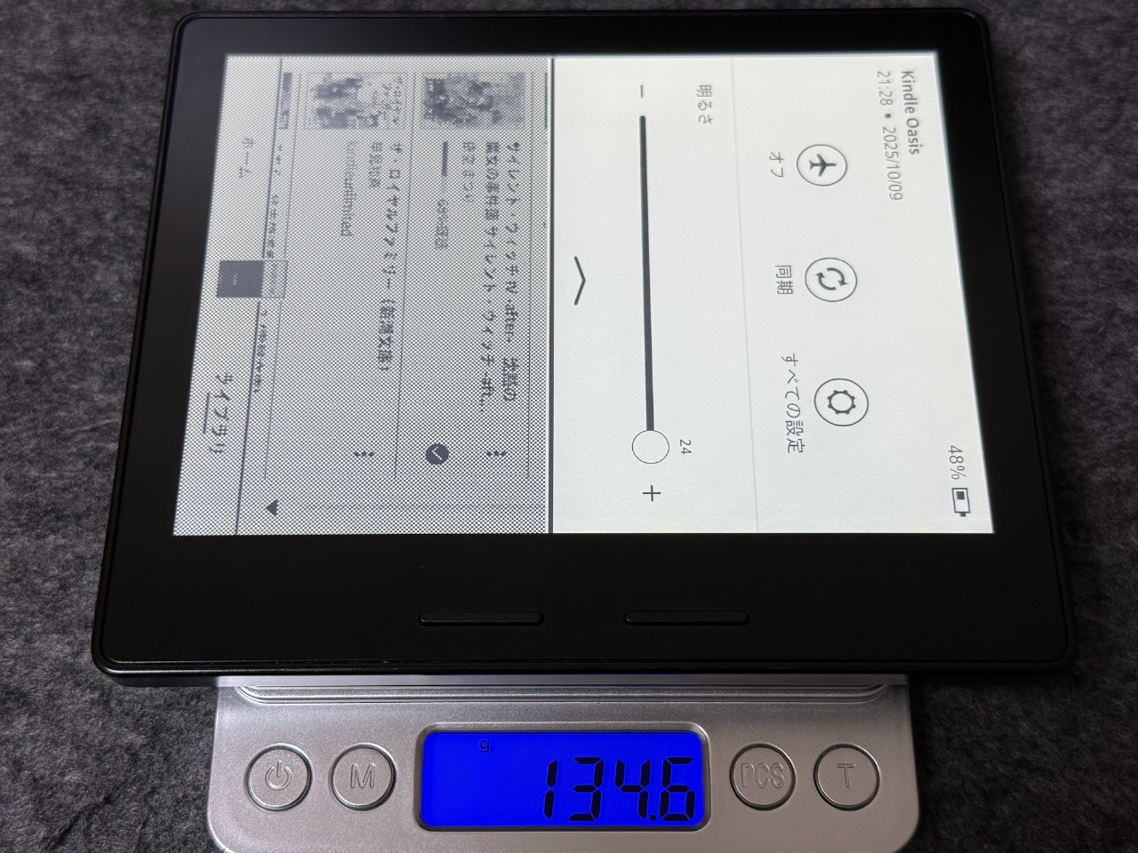 Kindle Oasisと比べると画面が1インチ大きくなっているところが良いです。重さは少し増えてしまいましたが予想外に持ちやすさはあまり変わりませんでした。