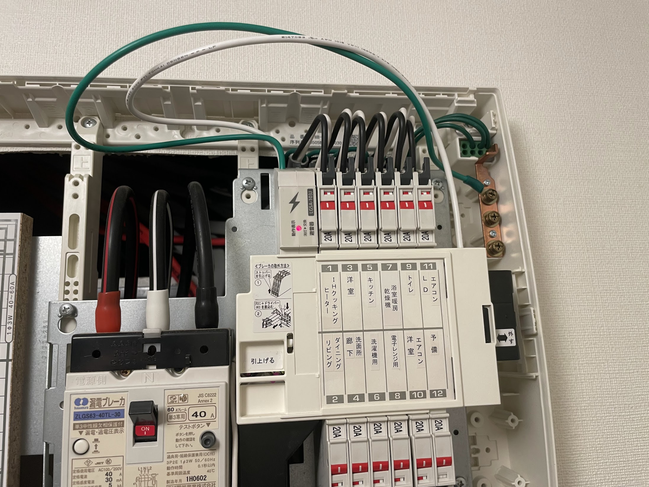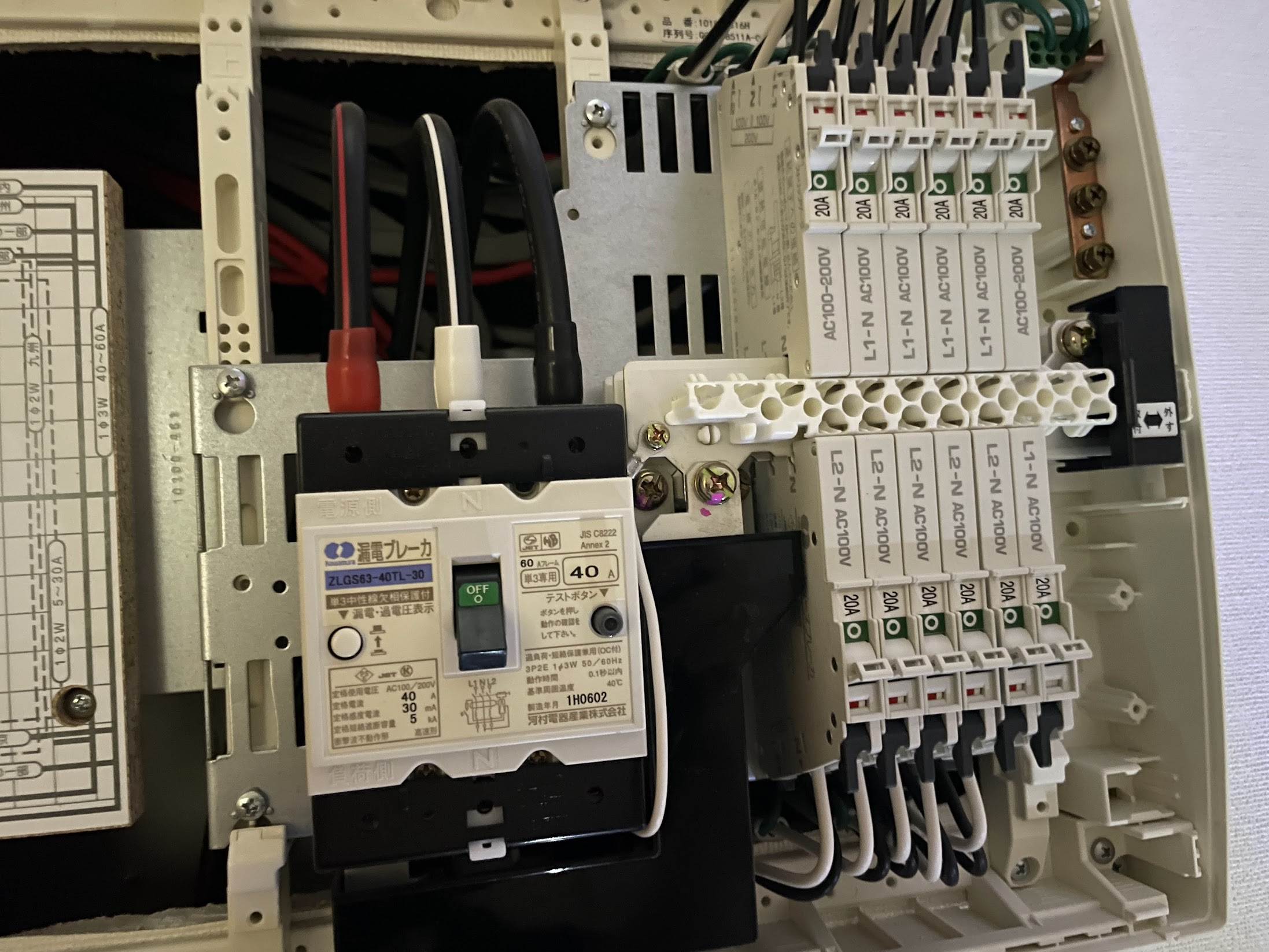 当然ですが分電盤を弄る前にブレーカーを落とします。資格取り立ての若葉マークが活線状態で作業することは絶対にやめましょう。
