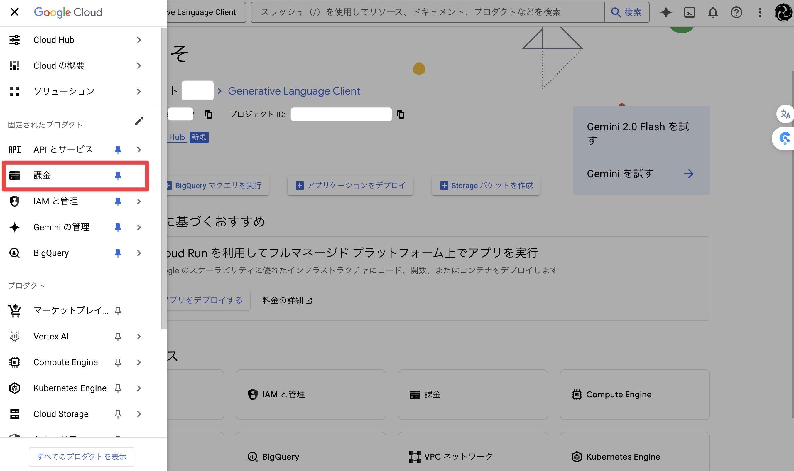 まず、Google Cloudのプロジェクトを開きます。Google AI StudioからAPIキーを生成した場合、多くは「Generative Language Client」というプロジェクト名になっているはずです。