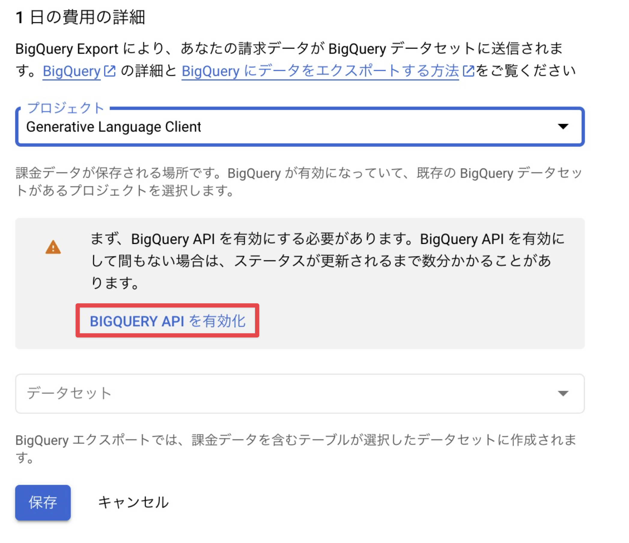 これまでBigQuery APIを利用したことがない場合は、「BigQuery APIを有効化」ボタンが表示されるので、クリックしてAPIを有効化してください。