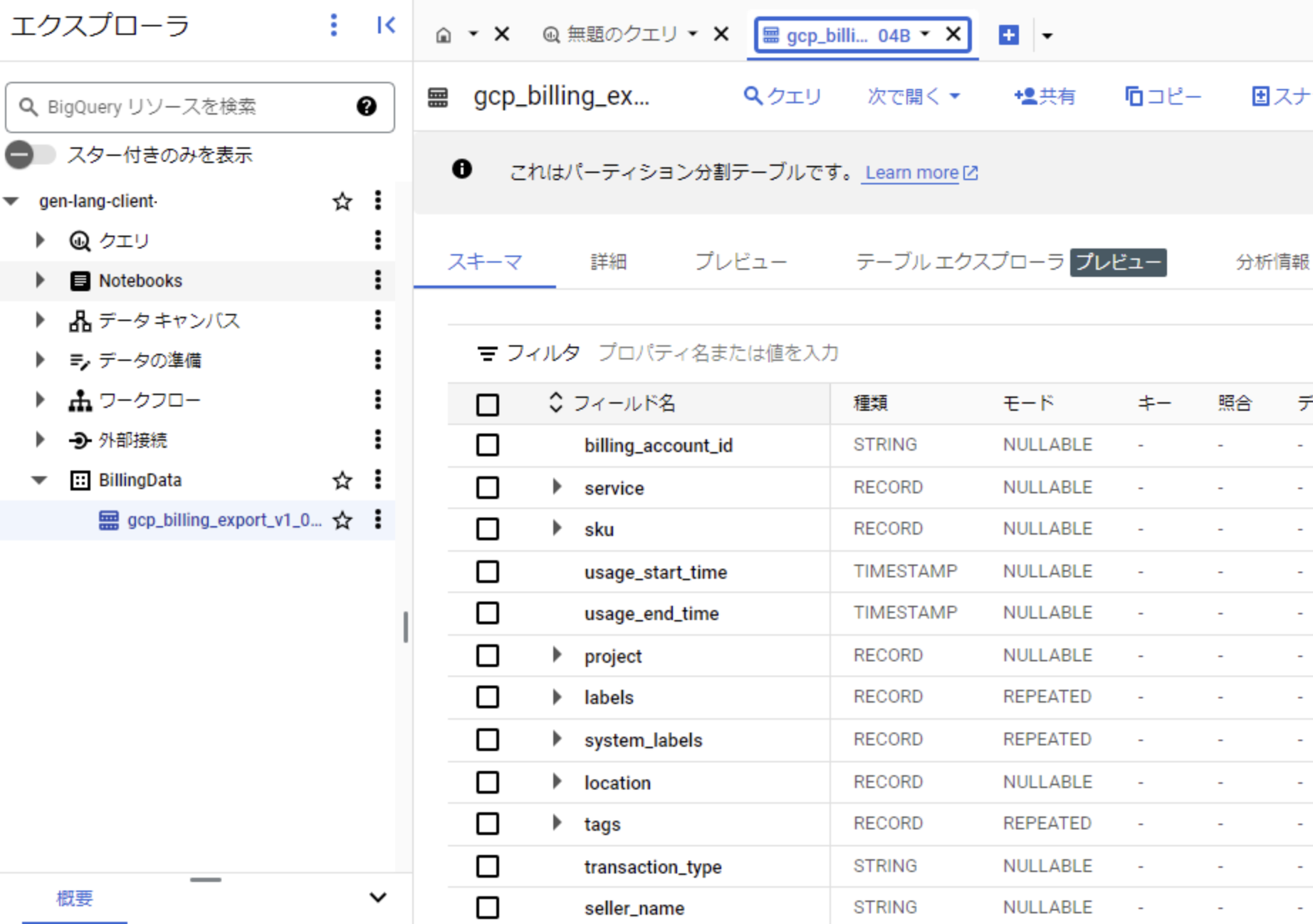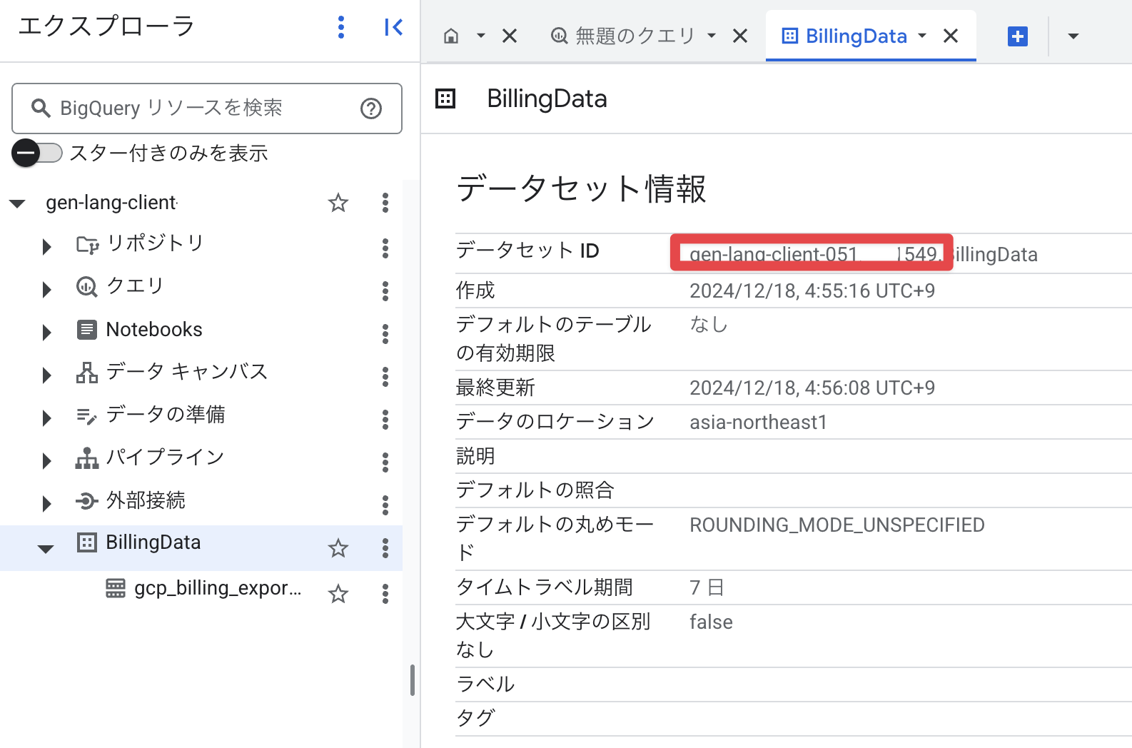 PROJECT_ID は、BigQueryコンソールのBillingDataテーブル情報で確認できます。例えば、「gen-lang-client-00000000.BillingData」と表示されている場合、.BillingData を除いた「gen-lang-client-00000000」がプロジェクトIDとなります。