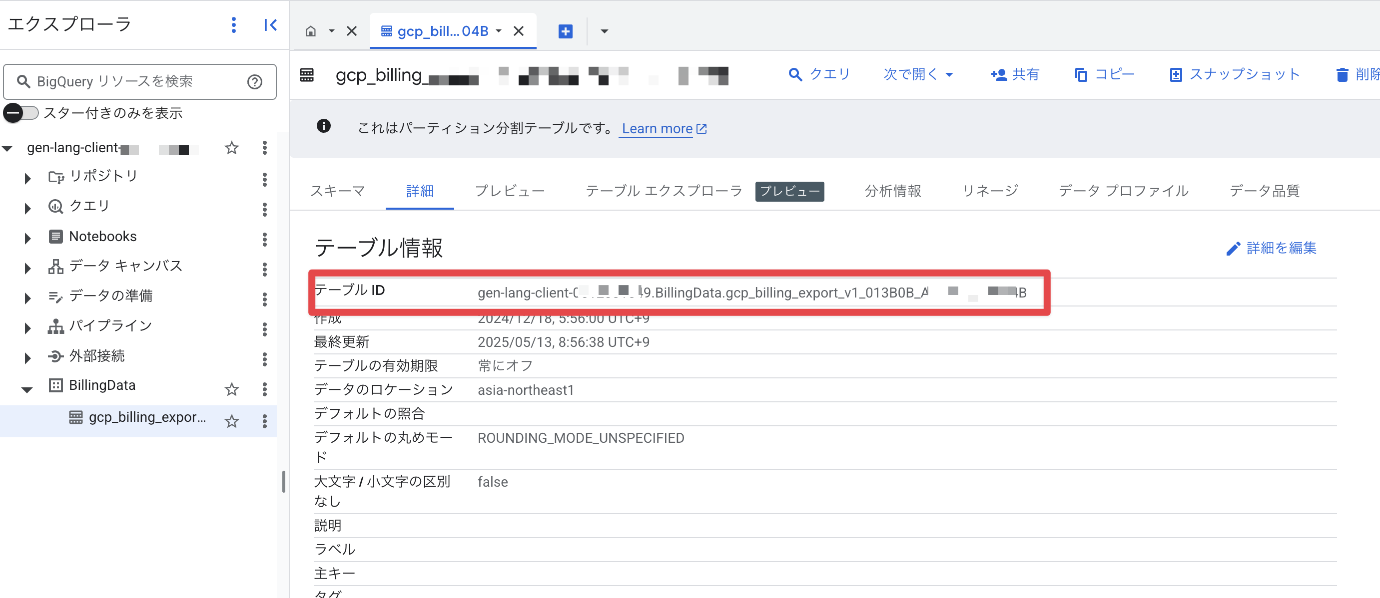 BILLING_TABLE も同様にBigQueryコンソールで確認します。先ほどのプロジェクトIDの下に、エクスポート設定で作成されたテーブルが表示されます。そのテーブルを選択すると詳細画面が開き、そこに記載されている「テーブルID」をコピーして貼り付けてください。