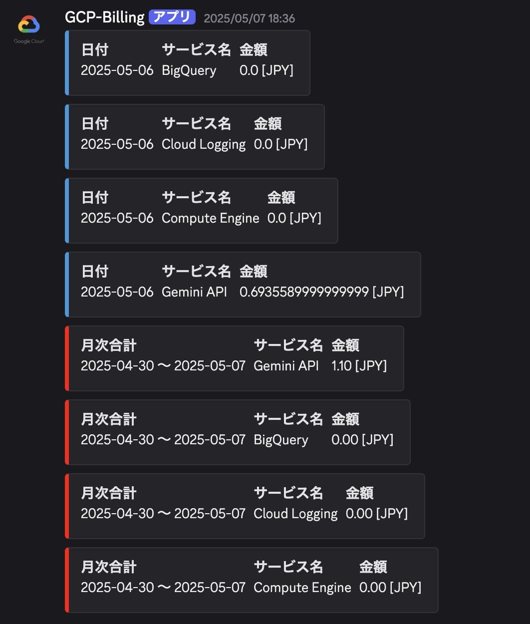 スクリプトが正常に実行されれば、DiscordにGoogle Cloudのサービス毎の利用料金(日次と月次累計)が投稿されるはずです。