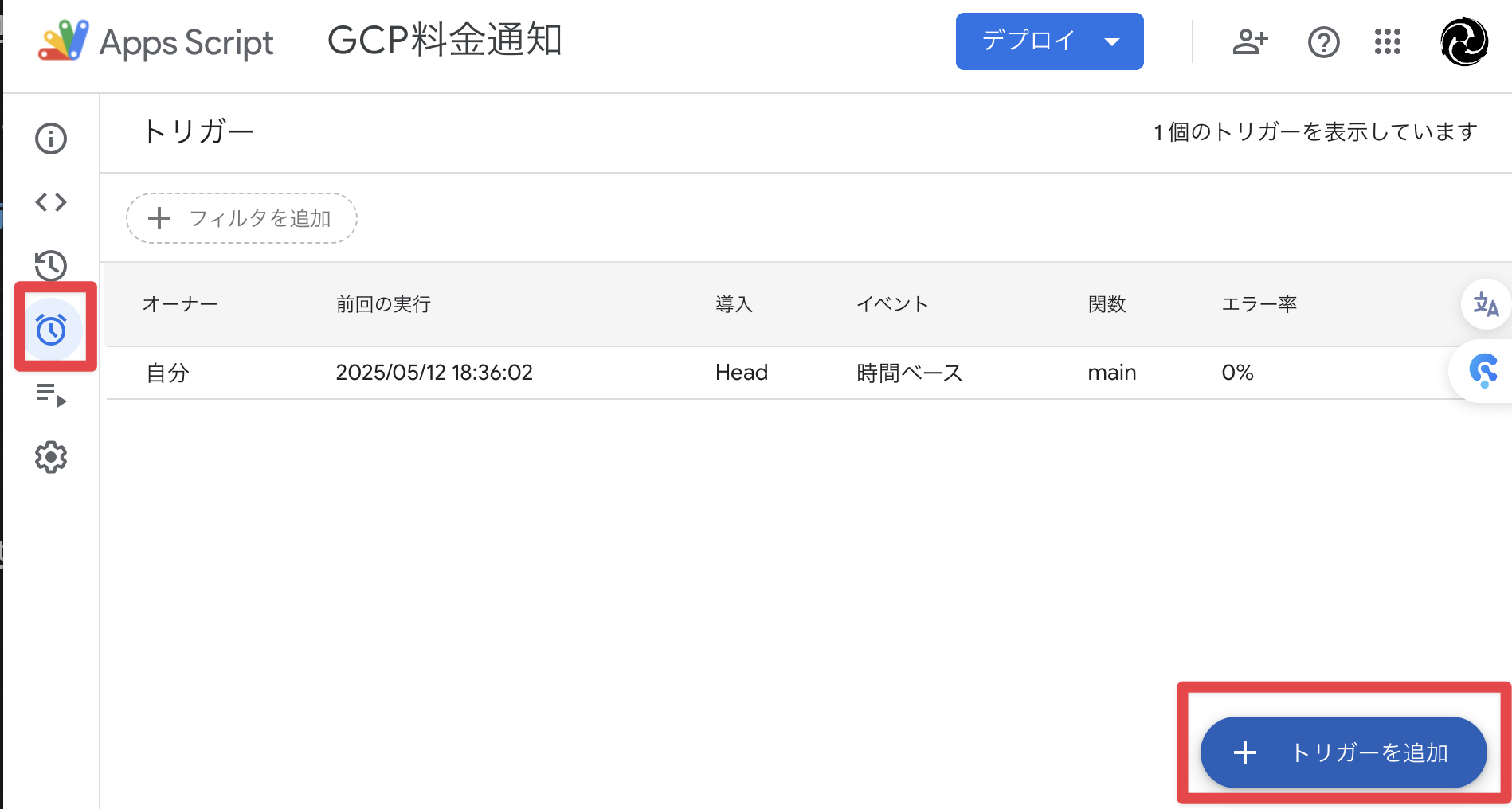 GASエディタの左側にある時計アイコンの「トリガー」メニューを選択し、「トリガーを追加」ボタンをクリックします。