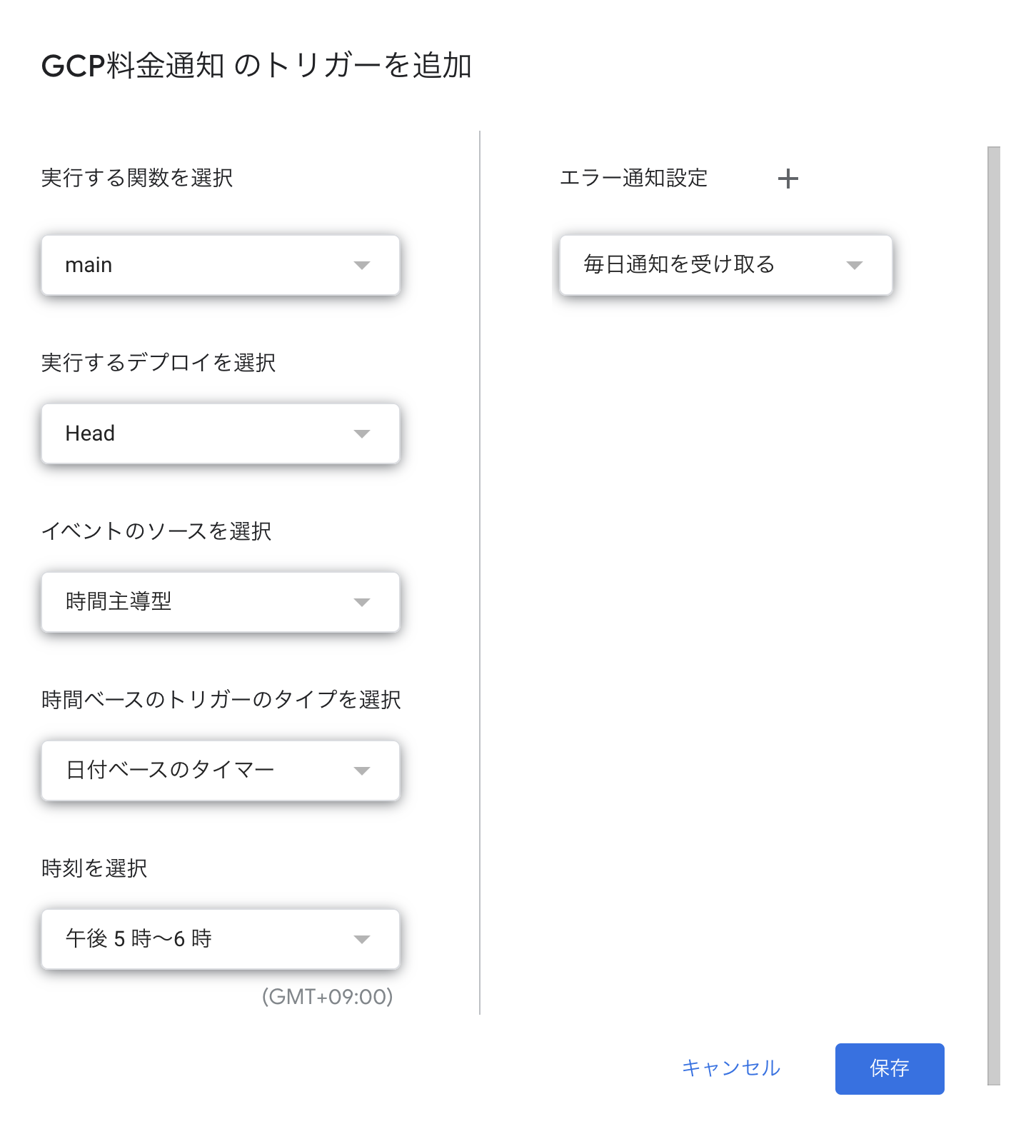 トリガー設定画面では、実行する関数(この場合は main)と実行タイミングを指定します。イベントのソースを「時間主導型」、時間ベースのトリガーのタイプを「日付ベースのタイマー」や「日タイマー」に設定し、実行したい時刻(例: 午前9時〜10時)を選択します。GASの仕様上、正確な分単位での指定はできず、指定した時間帯のいずれかのタイミングで実行されます。(これはおそらく、負荷分散のための仕様でしょう。)