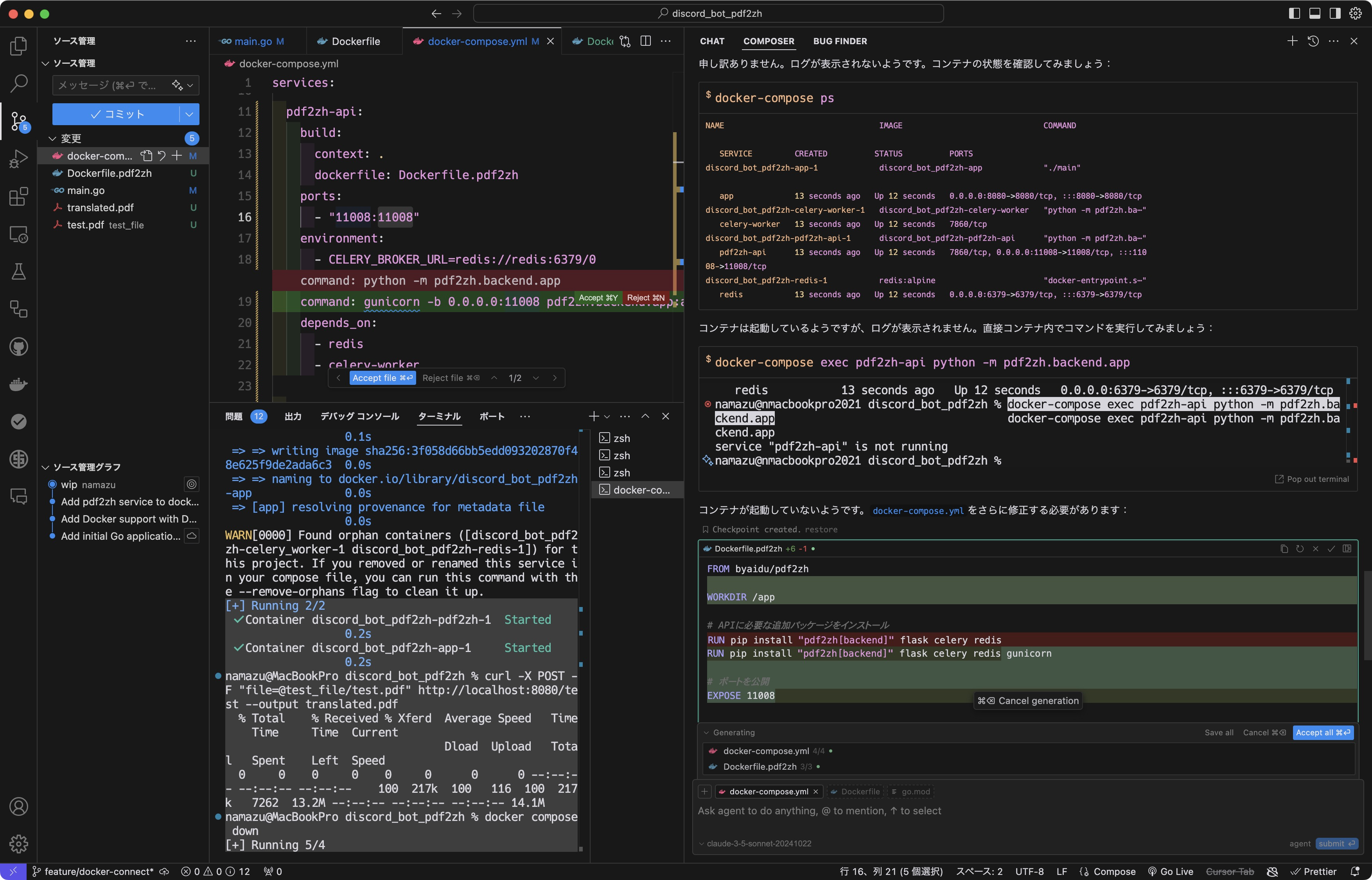 「main.goを実行するDocker環境を構築してください。作成後にcurlで http://localhost:8080/hello にGetでアクセスして「Hello World」が表示されてばOKです。」といったプロンプトを入力すると、Docker fileが構築され、curlで叩けるまで自動で環境構築、実行、エラーログ解析、修正と試行錯誤してくれます。