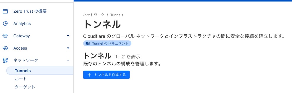 Cloudflareの管理コンソールにログインして、Zero Trust > ネットワーク > Tunnels に遷移します。