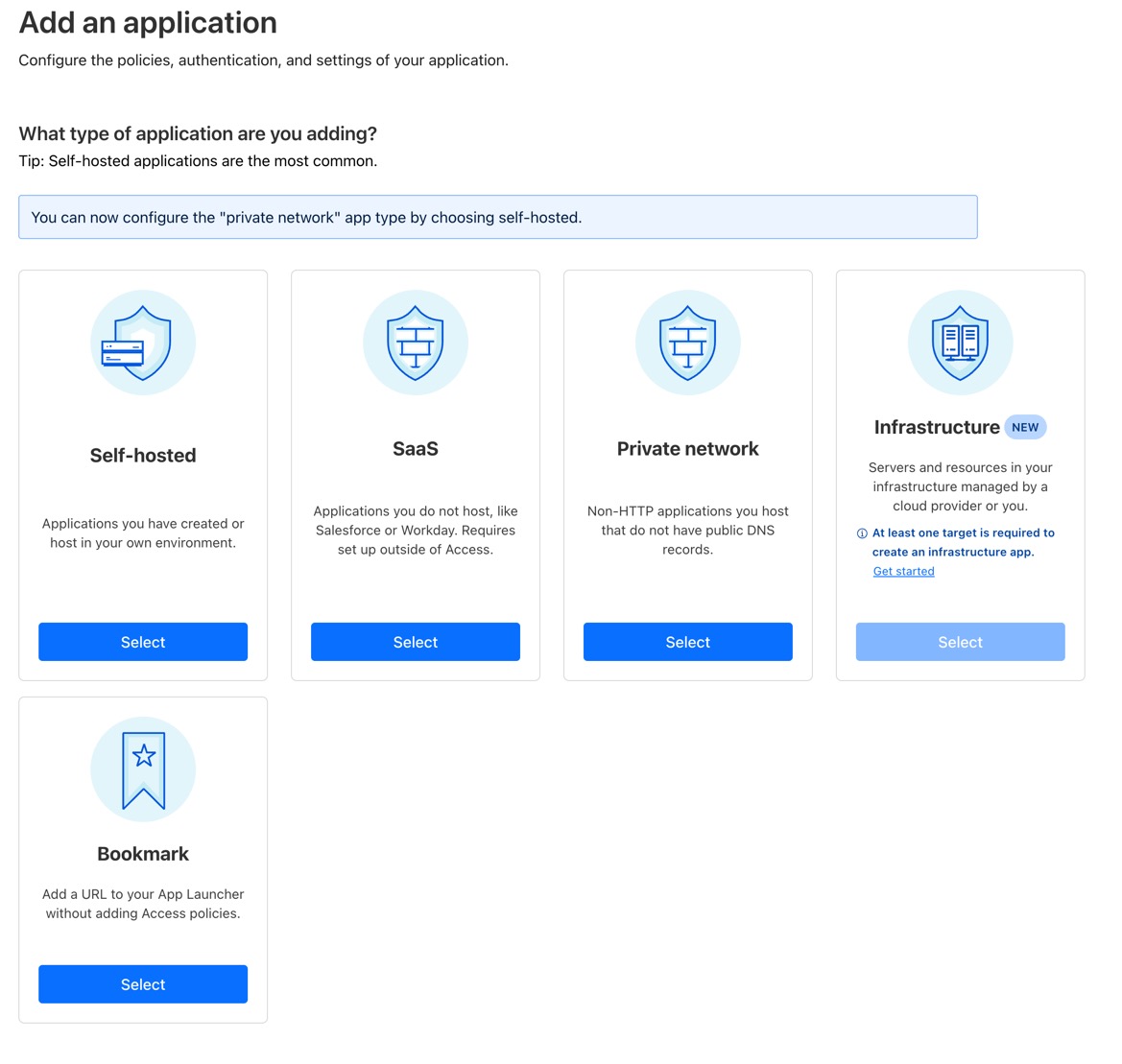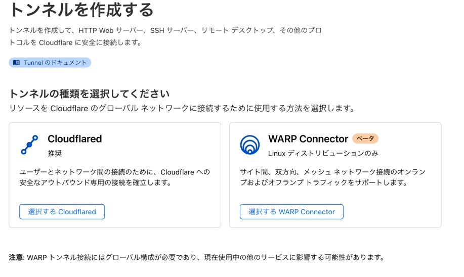 「トンネルを作成する」ボタンで遷移してトンネルの種類で「Cloudflared」を選択してください。