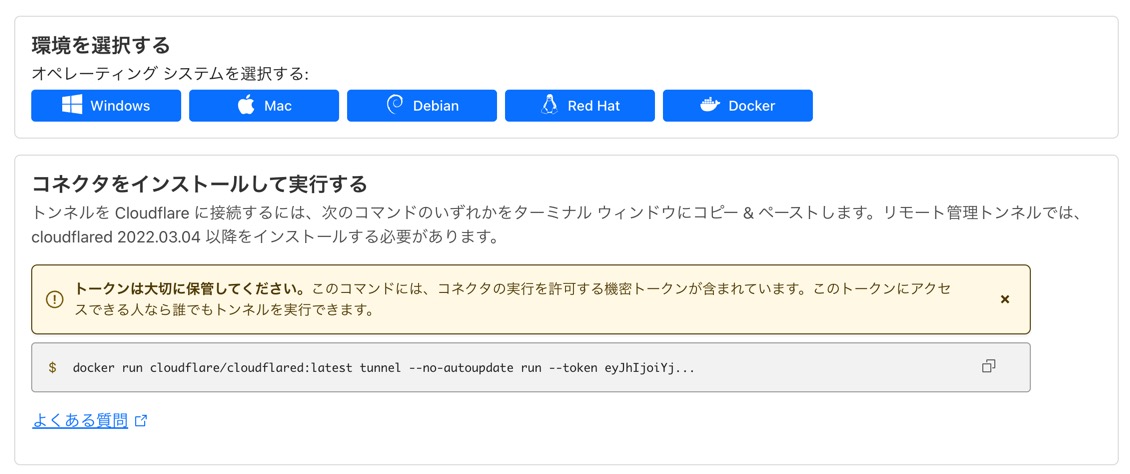 Cloudflaredをインストールする環境を選択してセットアップします。Linux環境であればDockerを利用するのが一番楽だと思います。コマンド一発で終わりますし、アップデート作業も楽です。