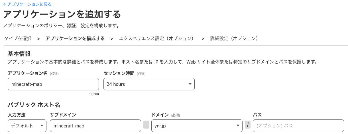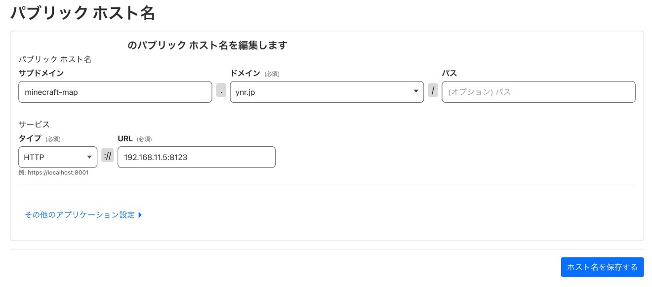 パブリックホスト名は先ほどTunnelで設定した物と同じです。例では「minecraft-map.ynr.jp」