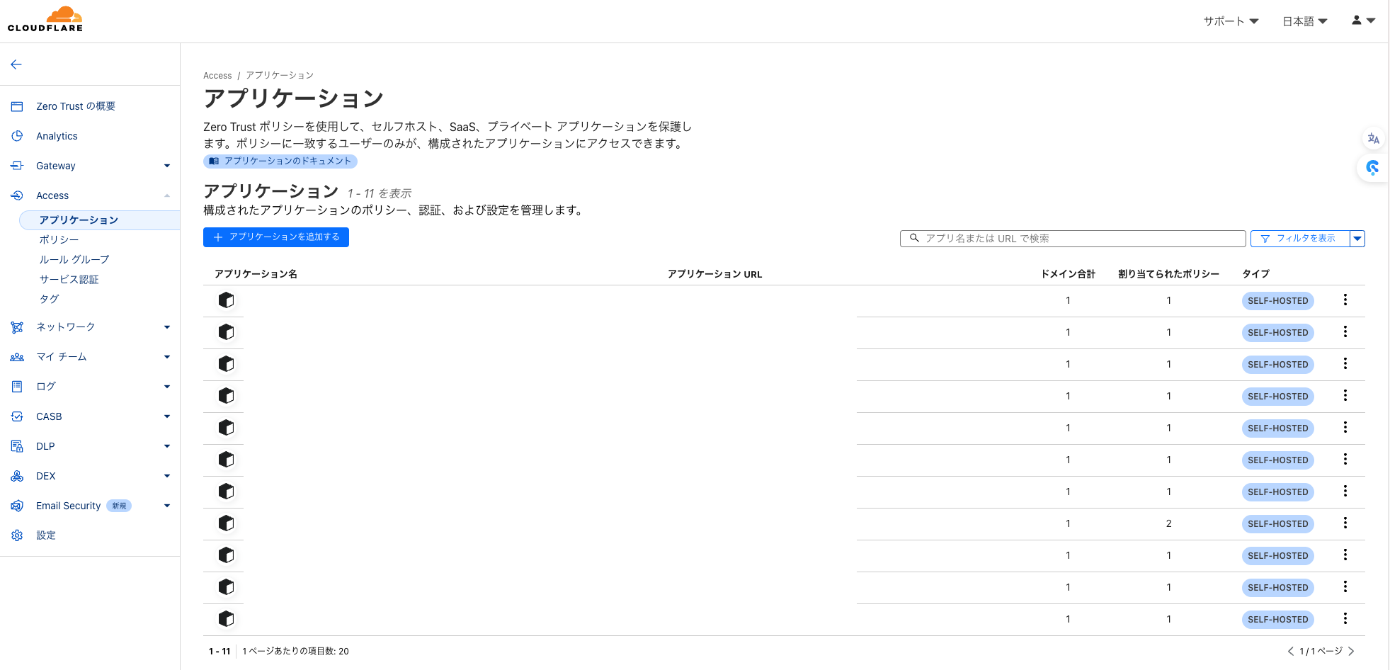 Tunnelと同じくZero TrustにあるAccessに遷移してアプリケーションから「アプリケーションを追加する」を選択します。