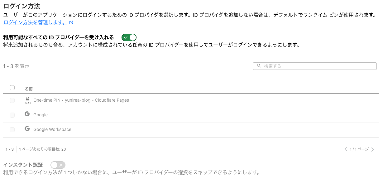 個人的なオススメとしてはログイン手法は1つのみにして「インスタント認証」を有効にすることでシームレスにGoogleログイン画面に遷移できるのでおすすめです。