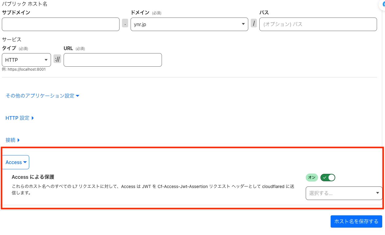 Cloudflare Tunnelの設定画面でパブリックホスト名を設定する際に「その他のアプリケーション設定」から「Accessによる保護」を有効化してホスト名を保存します。