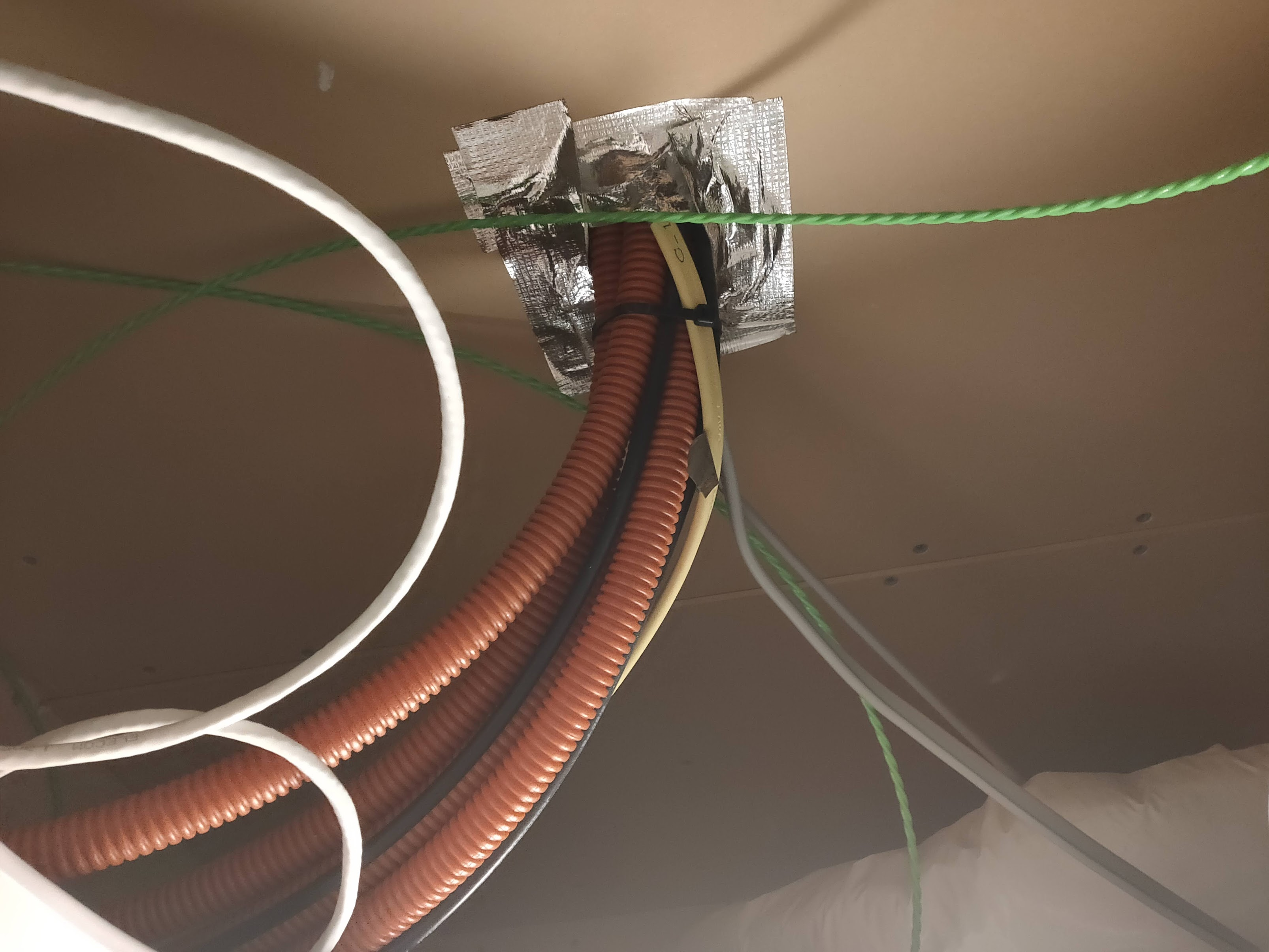 リビング以外の部屋には有線LANポートのみが生えているのですが、最大100Mbps接続になっていました。ついでにリビング側のAPとはVLANで分離されているようでした。 これでどちらもまともには使えない事が分かったので天井裏を覗いて配線を確認します。