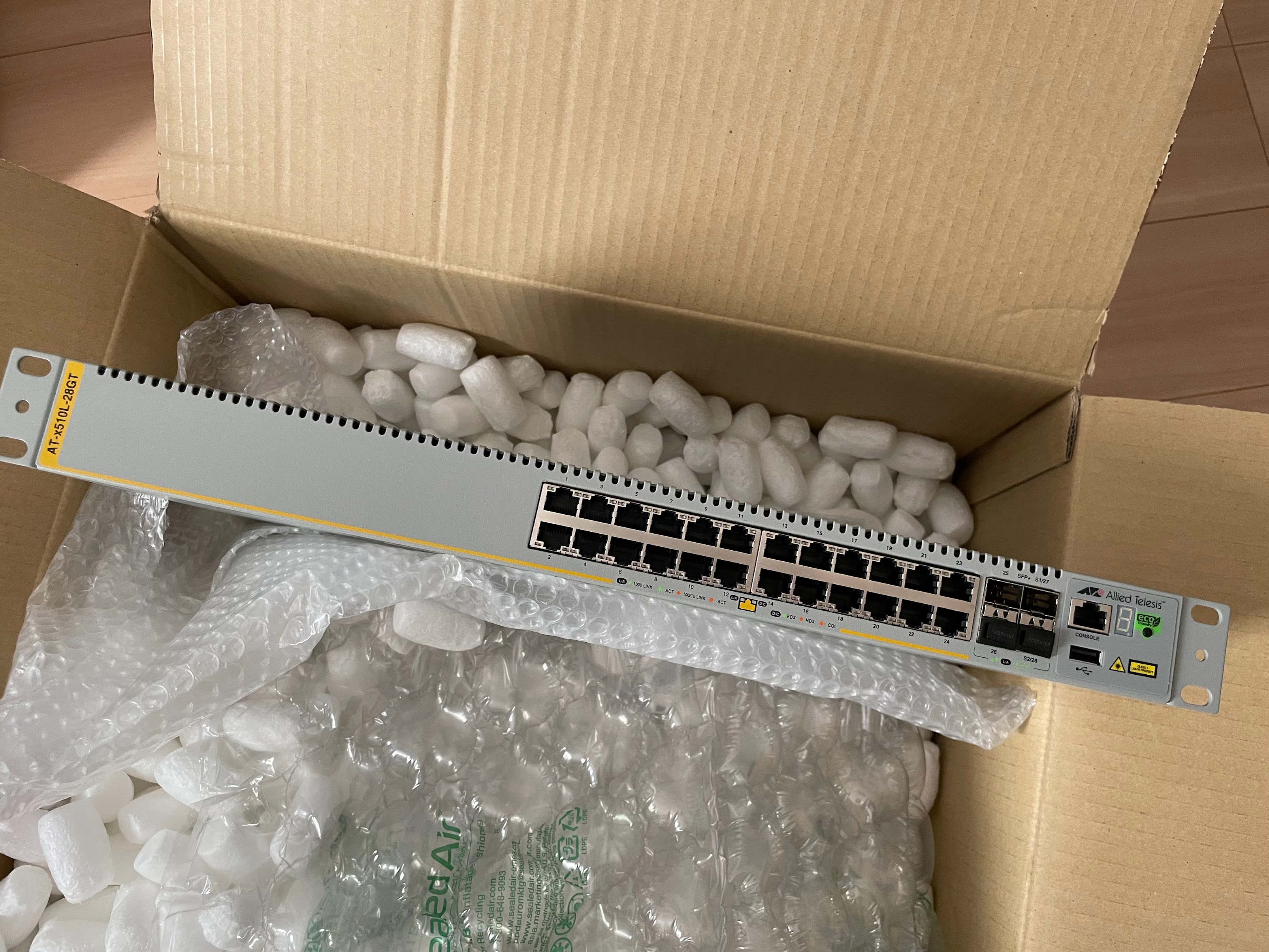 今回選定したのがアライドテレシスのAT-x510-28GTXです。ヤフオクで1万円程度で購入できました。 こちらは10G対応のSFP+ポートが4個、1G対応のRJ45ポートが24個あり実売1万円程度で入手できるスイッチとしては破格の商品です。 むかしは秋葉原で4000円程度で売られていたときもあったのでその時に2-3個買っておけば良かったと後悔しています。