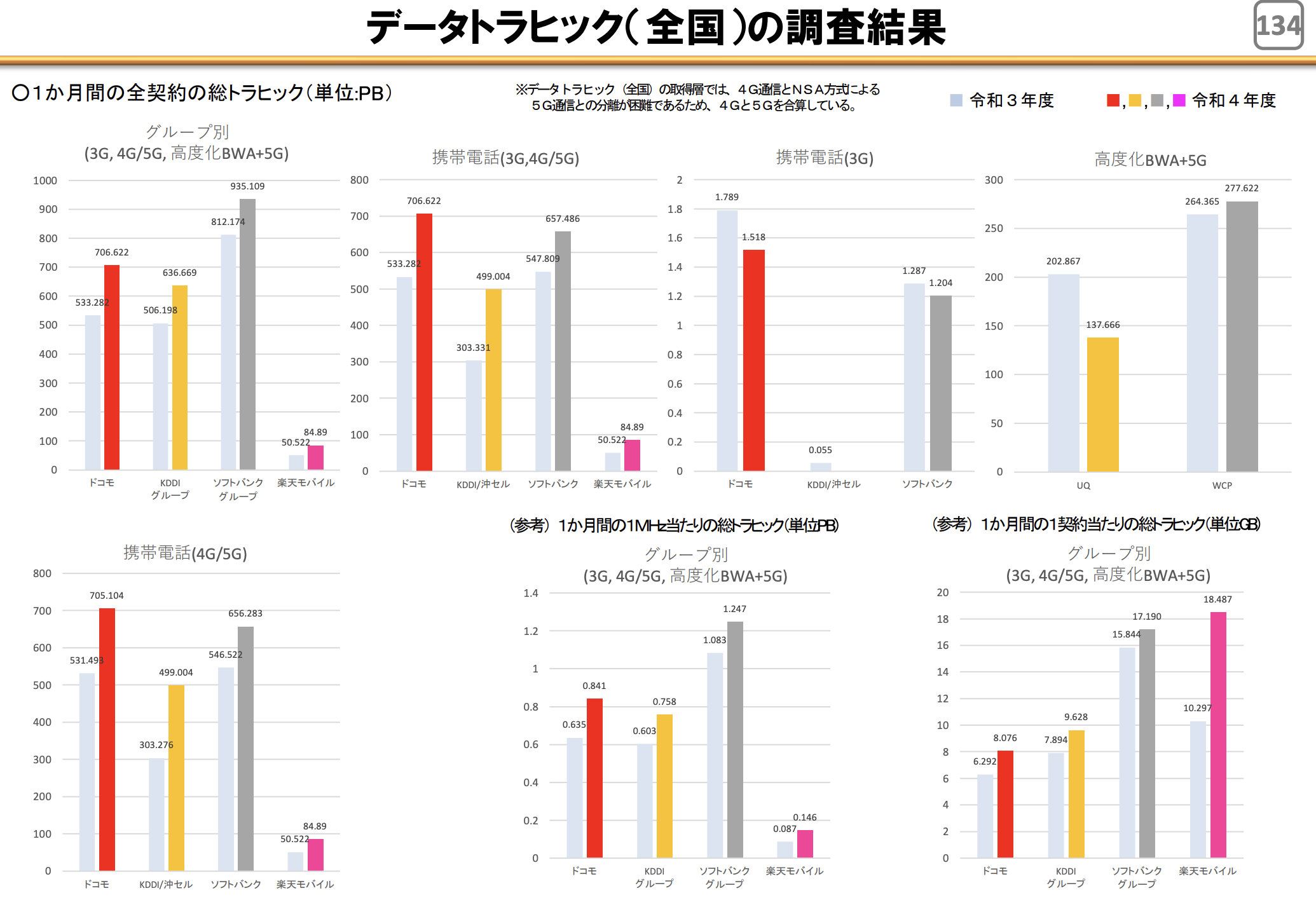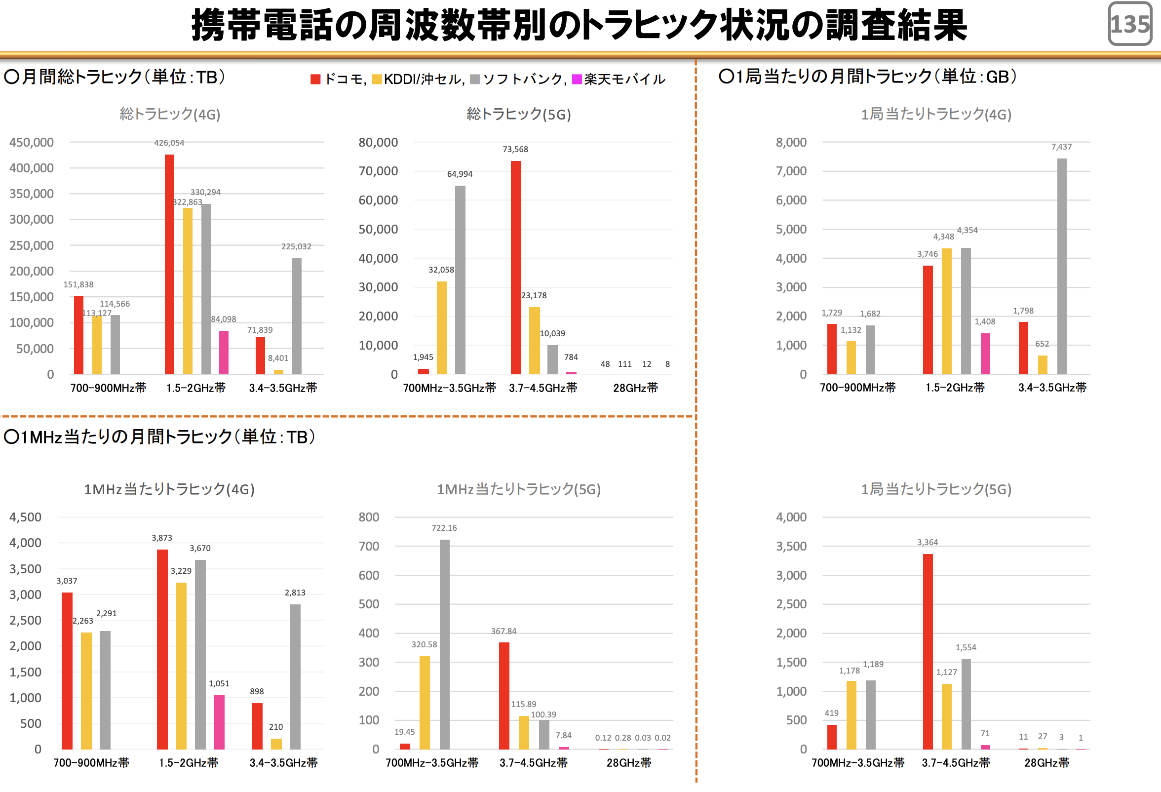 こちらは5Gも含めた1MHzあたりの通信量です。まだまだこちらは他社と比べて余裕があります。 つまり5Gに逃がせればまだまだ今の品質を維持できそうです。