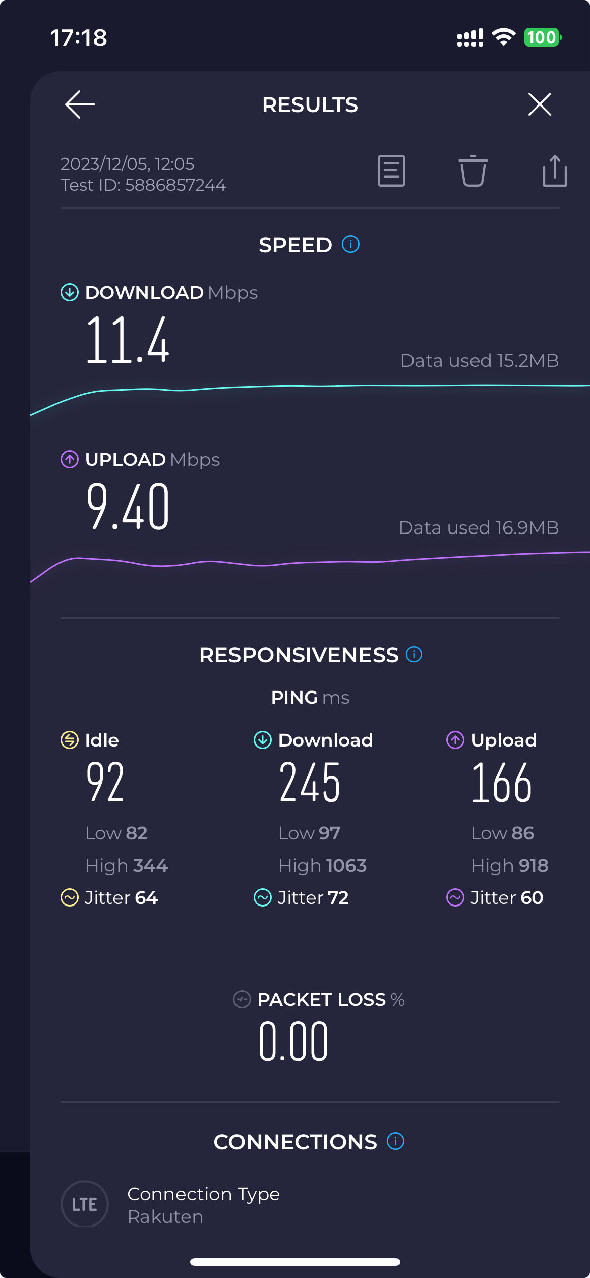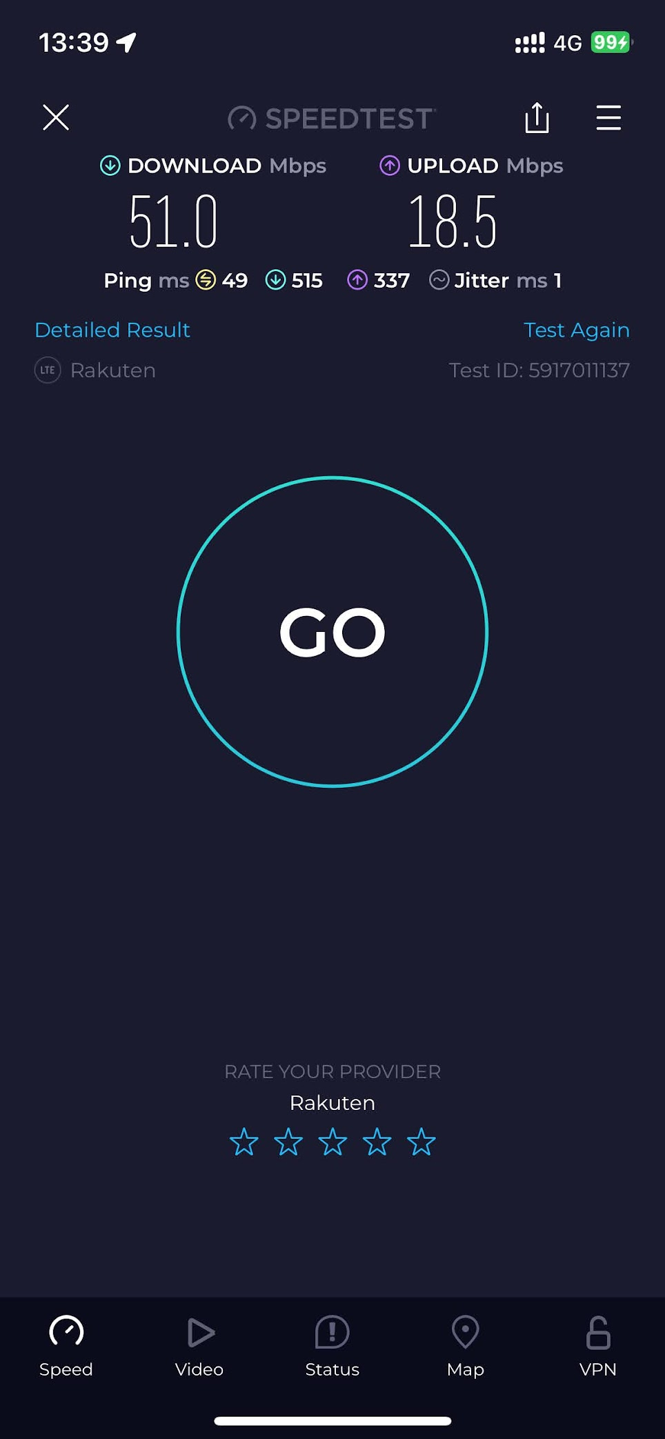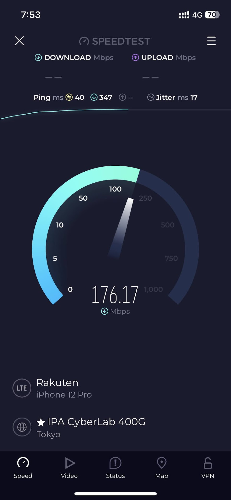 楽天モバイルの速度ですが、4Gに限れば概ね数十Mbps程度。良くて100Mbpsを超えるくらいです。これは楽天モバイルエリア、auパートナーエリア双方で似たような結果です。