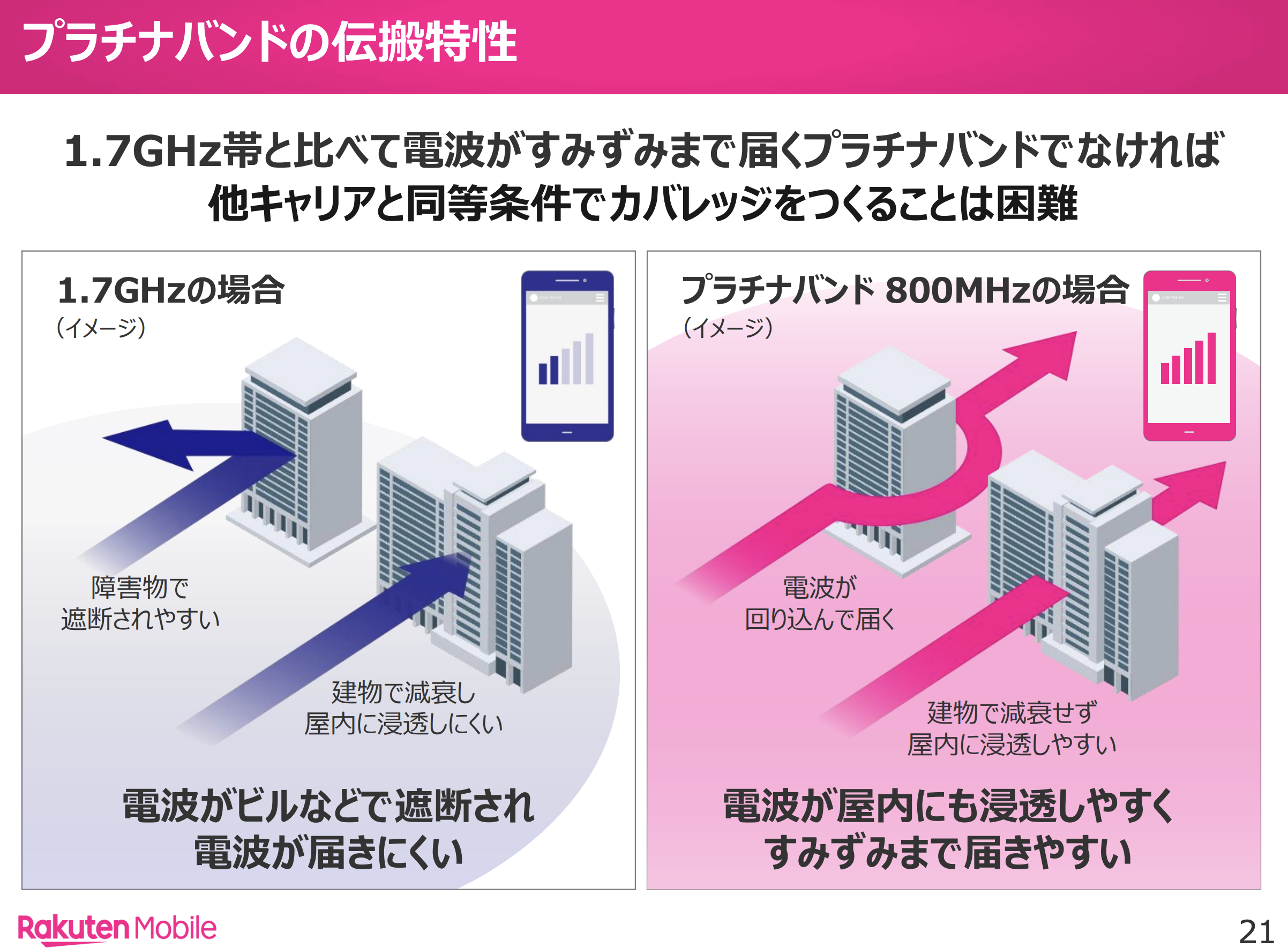 楽天自社のプラチナバンドが提供されればその分パートナーエリアのauエリアが縮小されます。auは10〜15MHz幅があったのに楽天モバイルは3MHzの幅です。恐らく相当通信速度は遅くなると思われます。