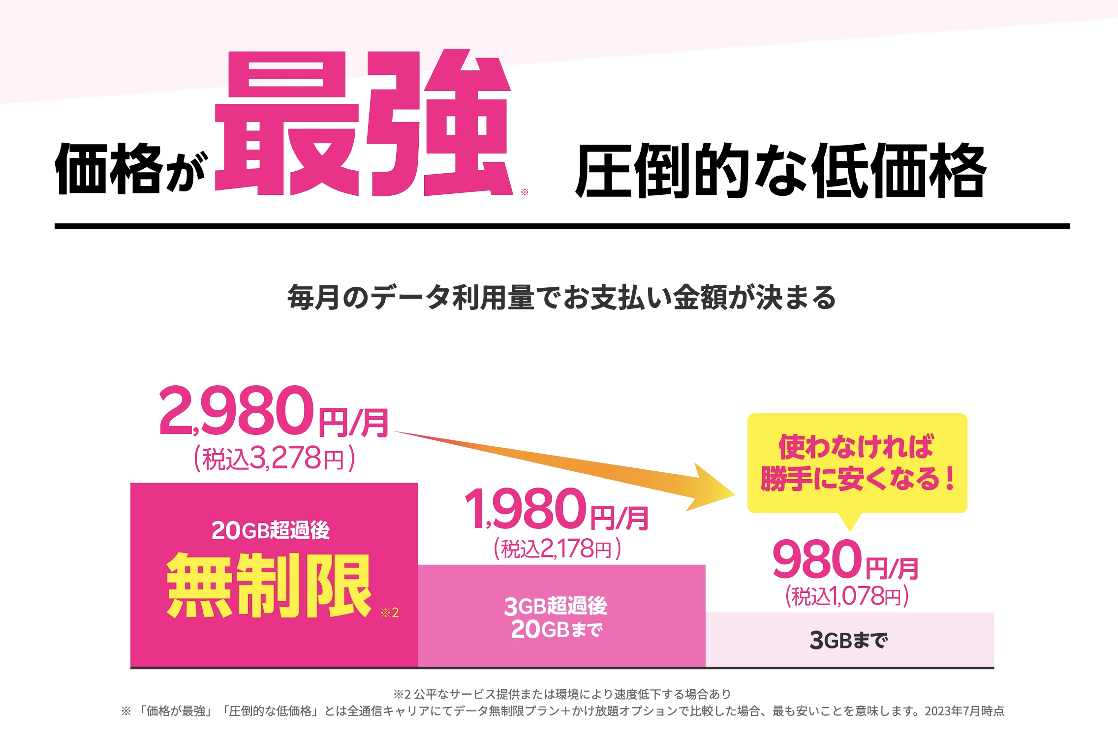 楽天モバイルは1プランです。2980円で通話も通信も使い放題。