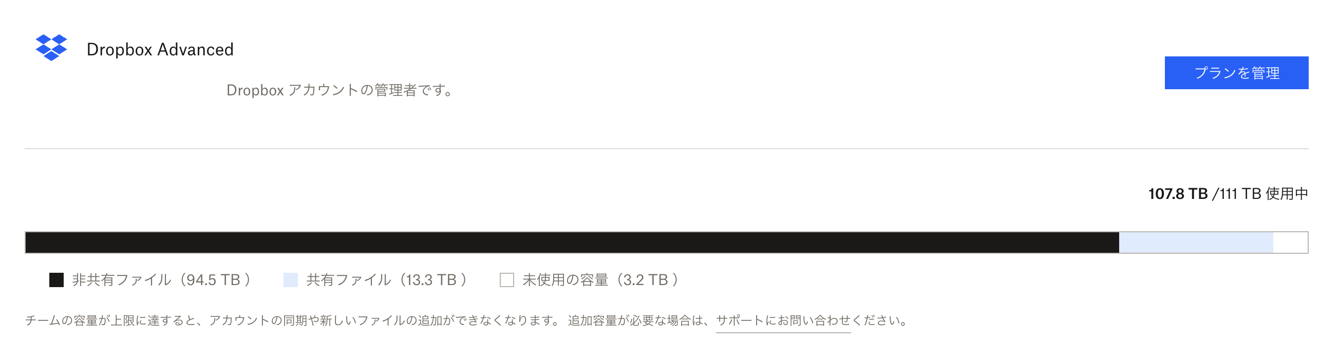 Dropbox側の激変緩和策としては5年間は現在の使用量に5TBを追加して提供するという内容でした。 弊チームに割り当てられた容量は111TBになりました。