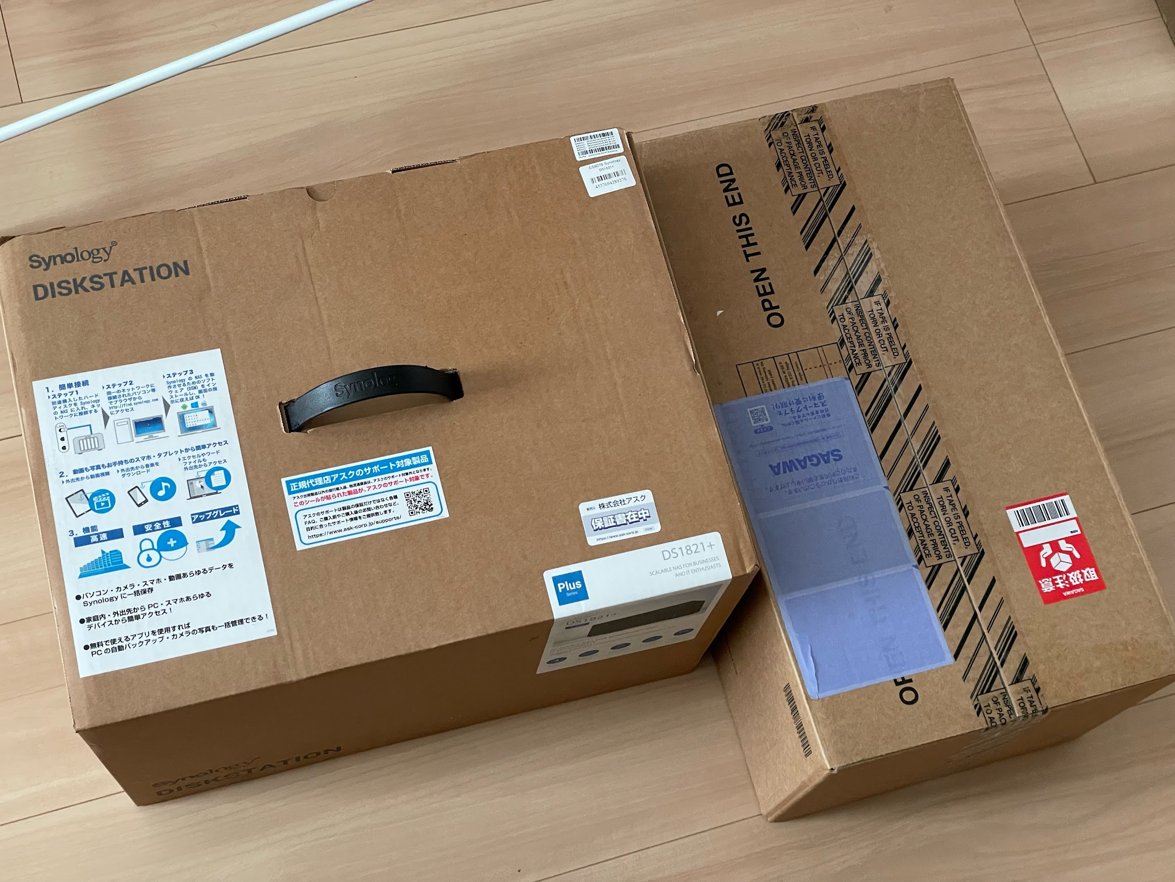 NASもHDDもどちらもどでかい箱で届きました。右の箱がHDDの箱ですが、HDDしか入ってないとは思えない大きさです。下手したらパソコン一台入ります。