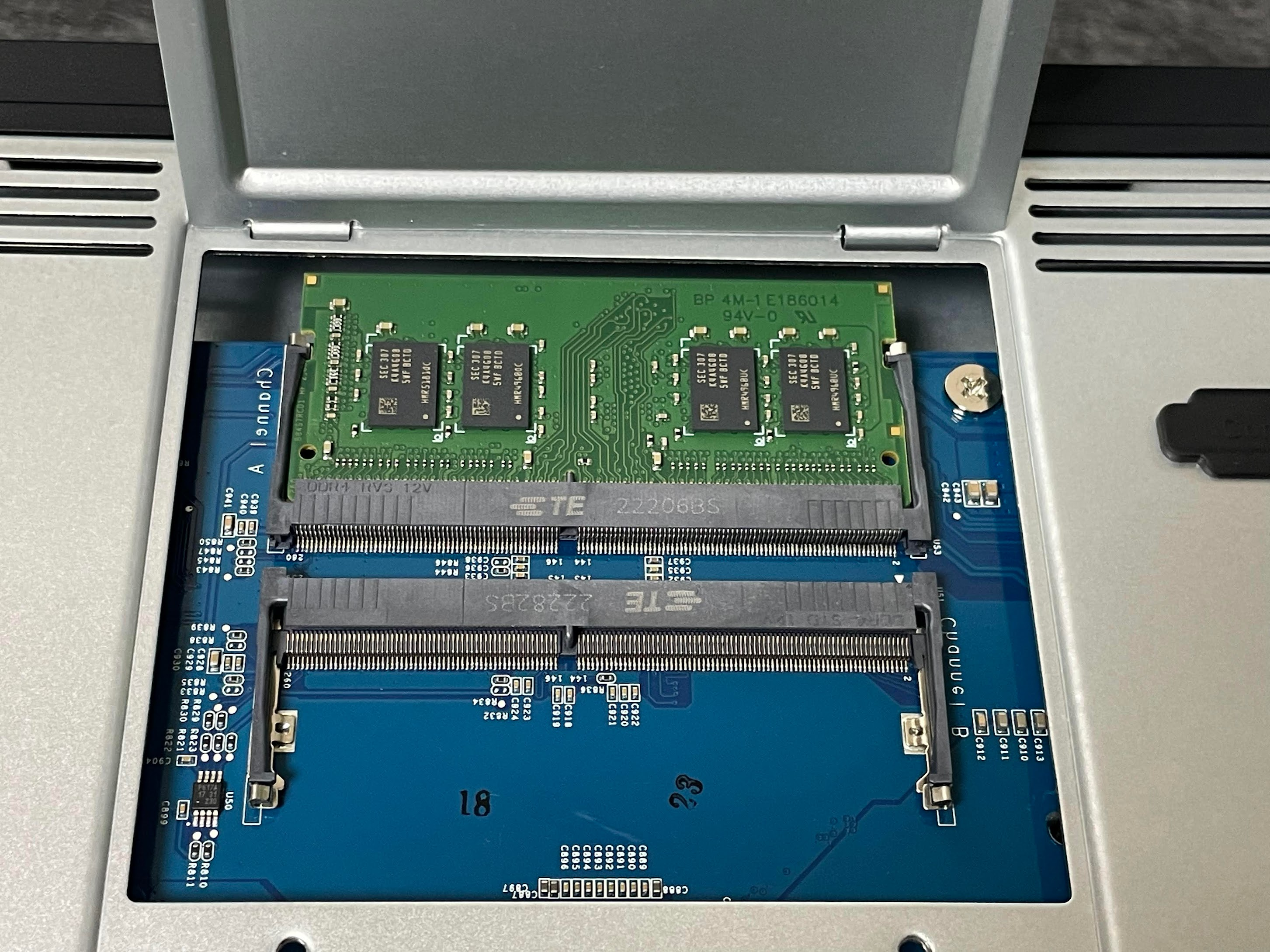 NASをひっくり返し底面のネジを2個取るとメモリスロットがあります。デフォルトで4GBが挿さっていますのでこれを32GBに交換しました。