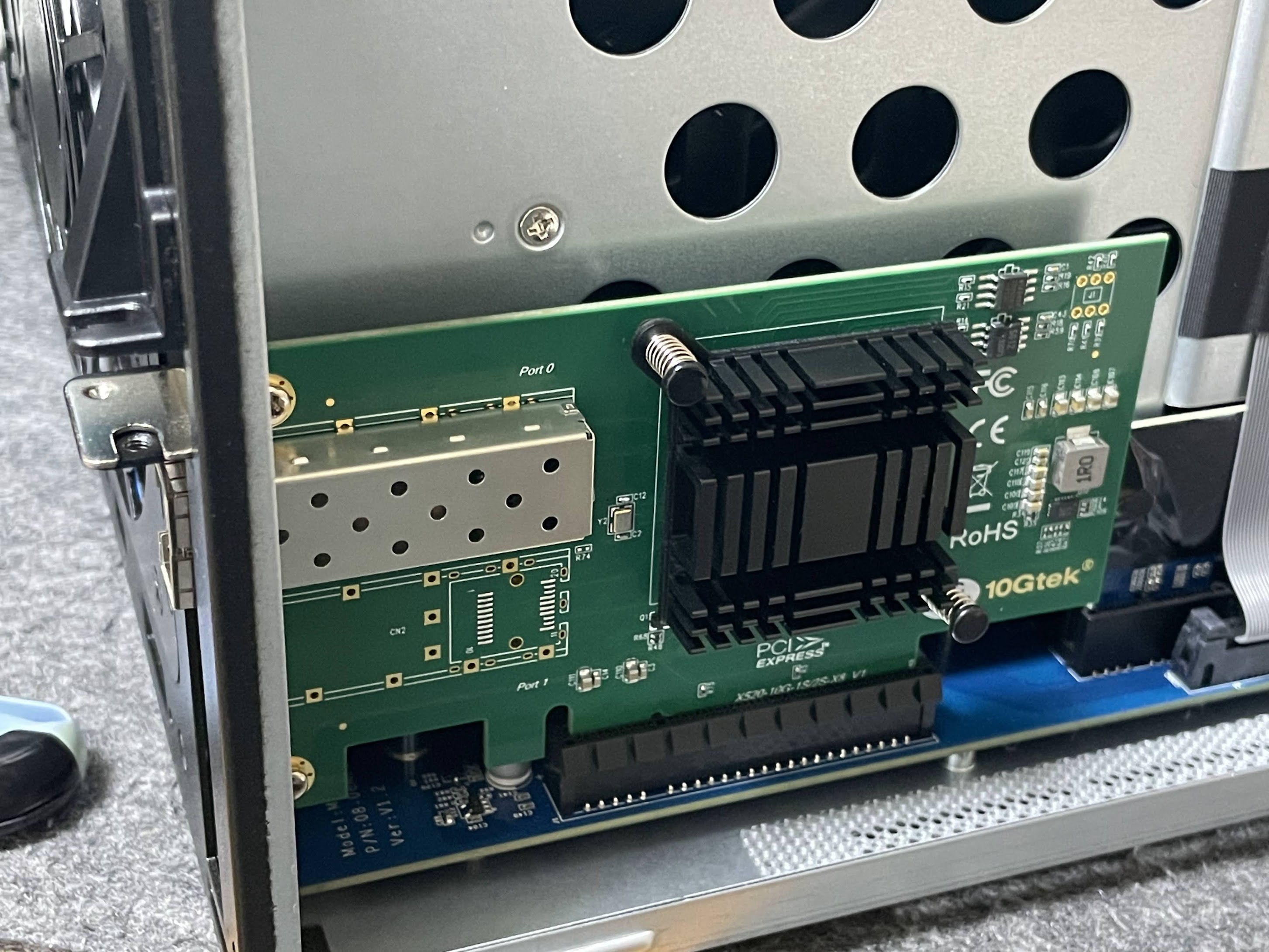Synology純正のNICは1000Base-Tしか提供されてませんのでSFP+の適当なNICを追加します。前回、宅内の主要経路を10G化するときに購入した10Gtek Intel互換NICを利用しました。