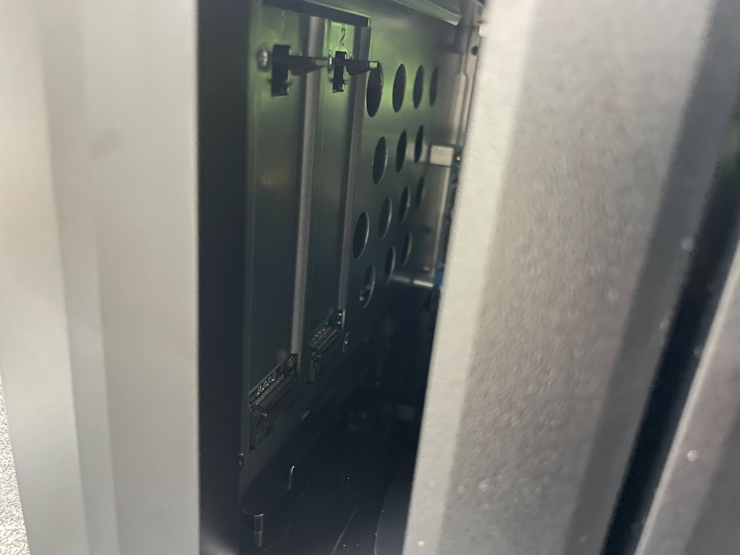 SSDのスロットは表面一番左のHDDスロットを抜くと出てきます。ここに2枚刺しておきます。