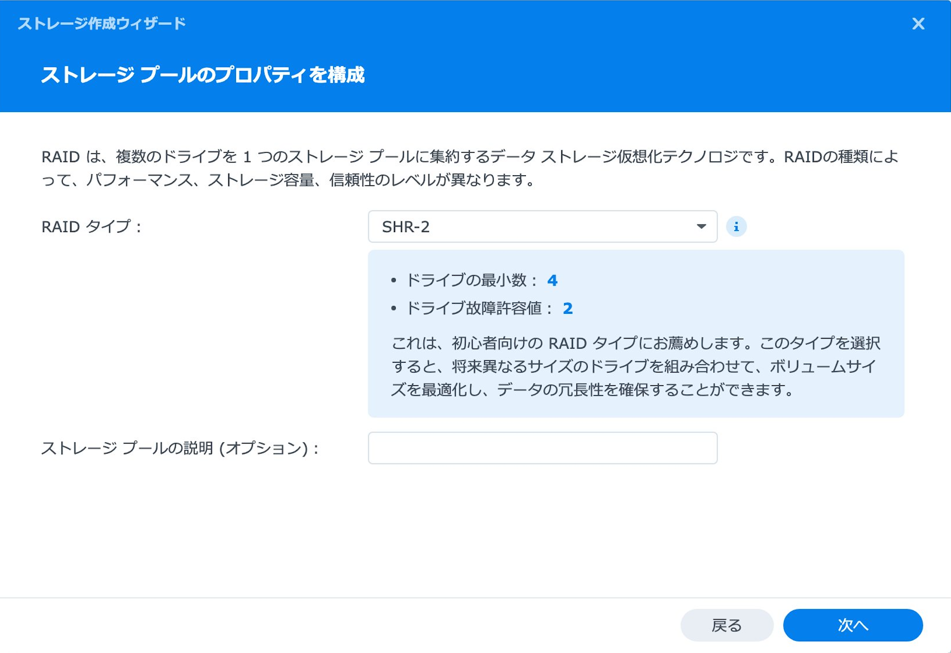 初期設定を終わらしたらストレージマネージャでボリュームを作成します。SHR-2がRAID6相当です。