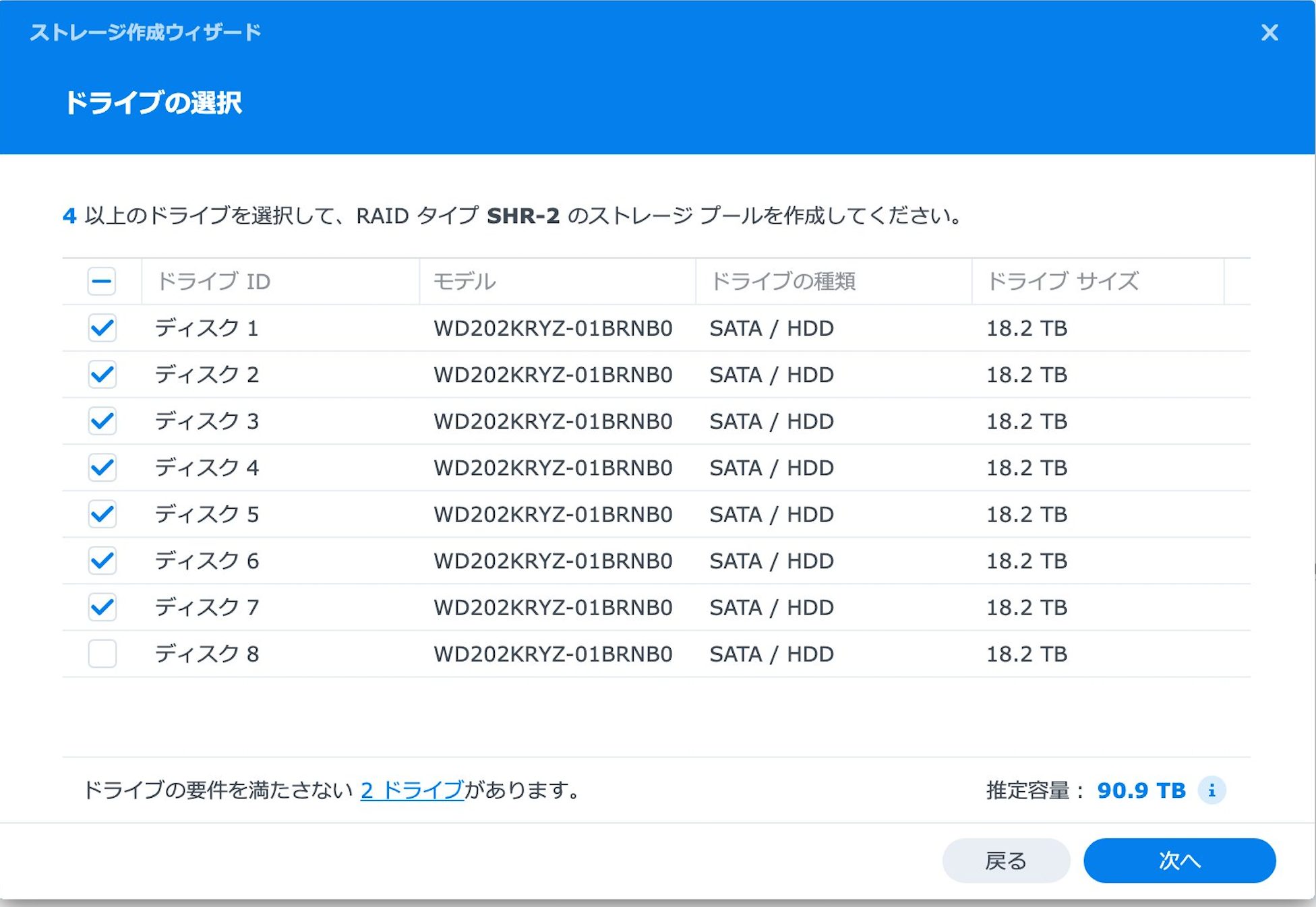 Synologyの互換性確認製品内にまだ20TB製品がないので保証不可能になりますが20TBで考えれば実容量でも90TBを超えそうです。