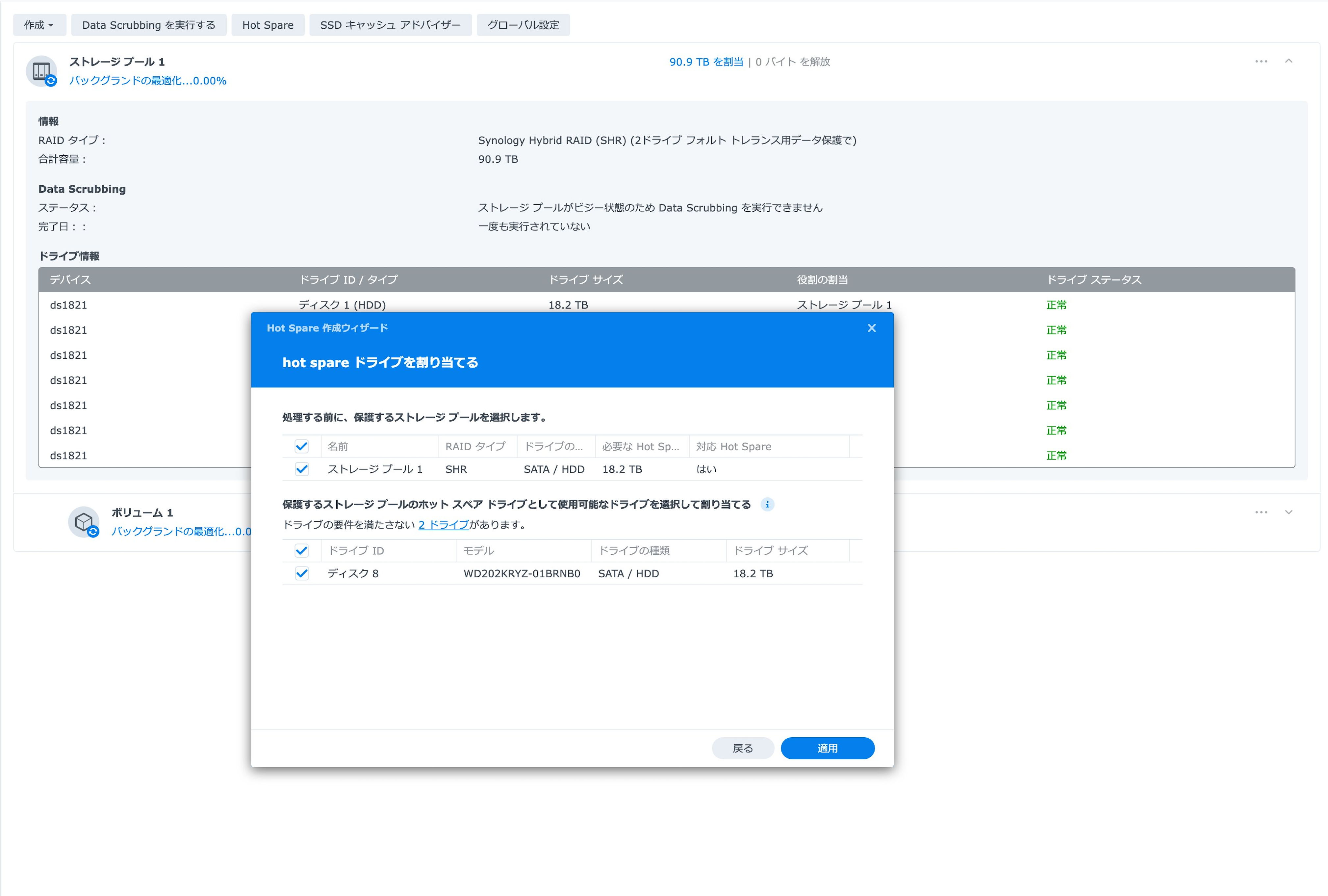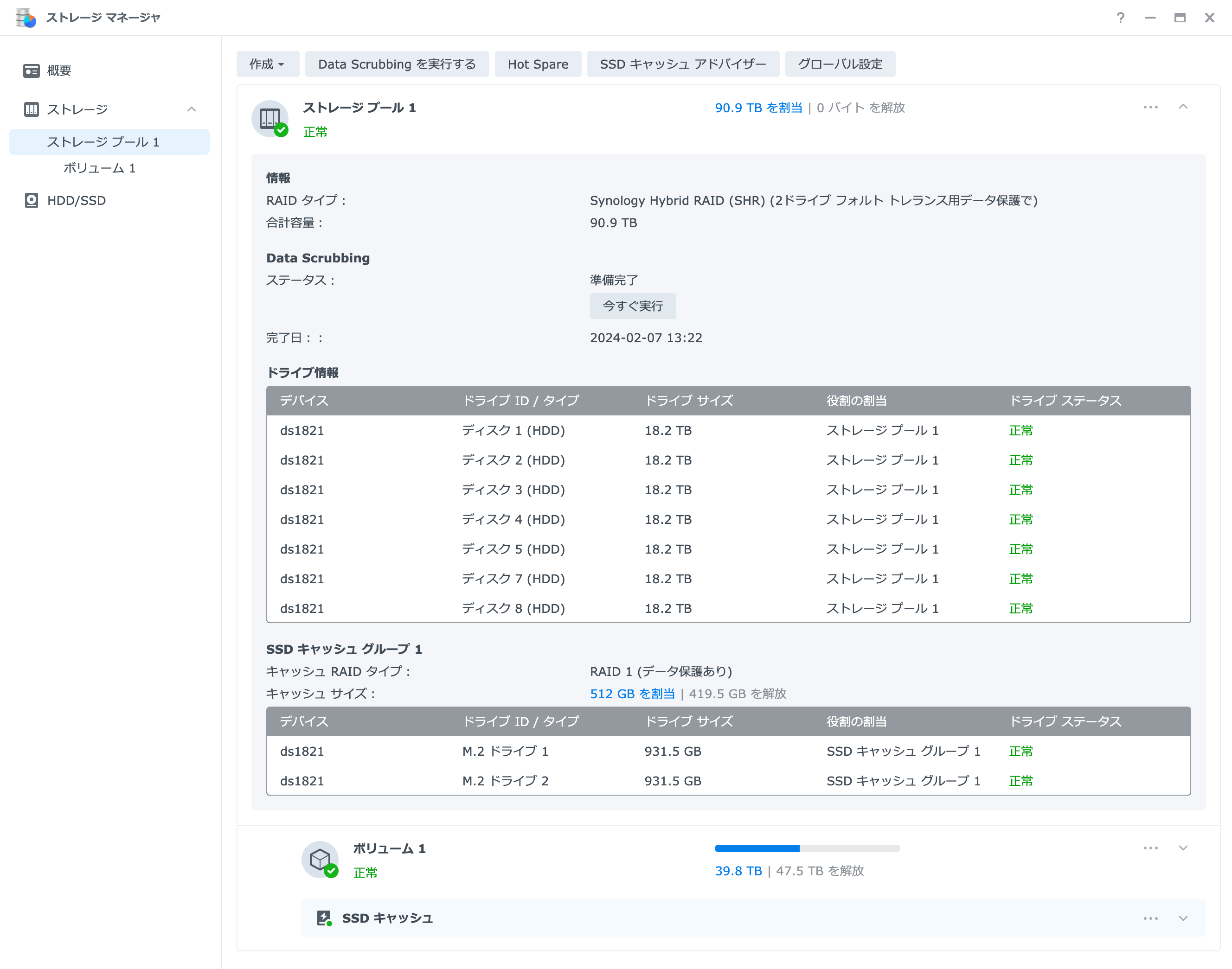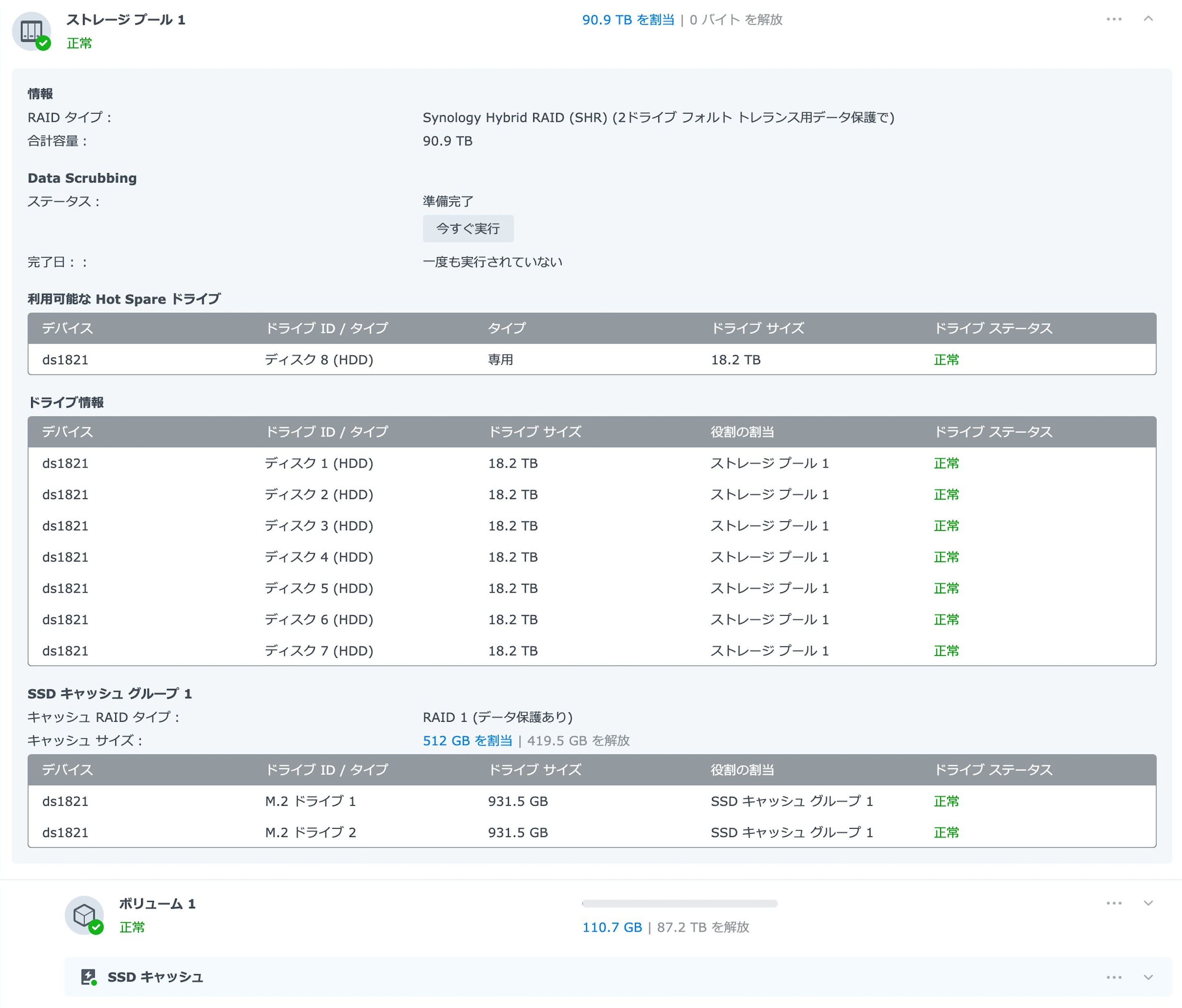 DiskStation DS1821+の1ボリューム最大サイズは108TBですのでこれ以上大容量のHDDが出てきたとしても20TBでリプレイスしていくと思います。