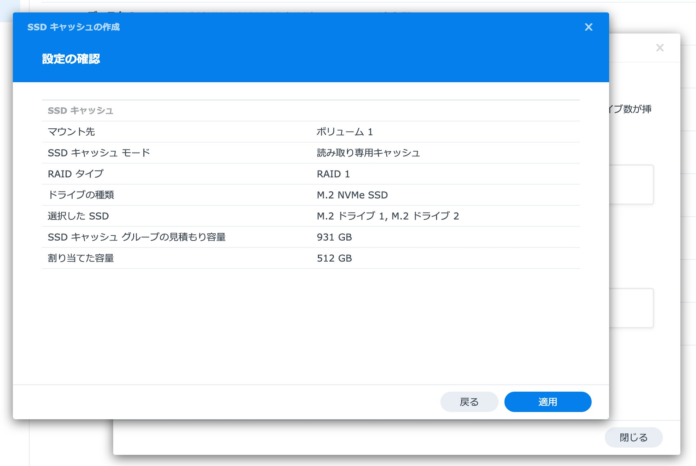ボリュームができたらSSDキャッシュの作成をします。前述の通りRAID1で利用し容量は約半分の512GBのみ仕様しています。