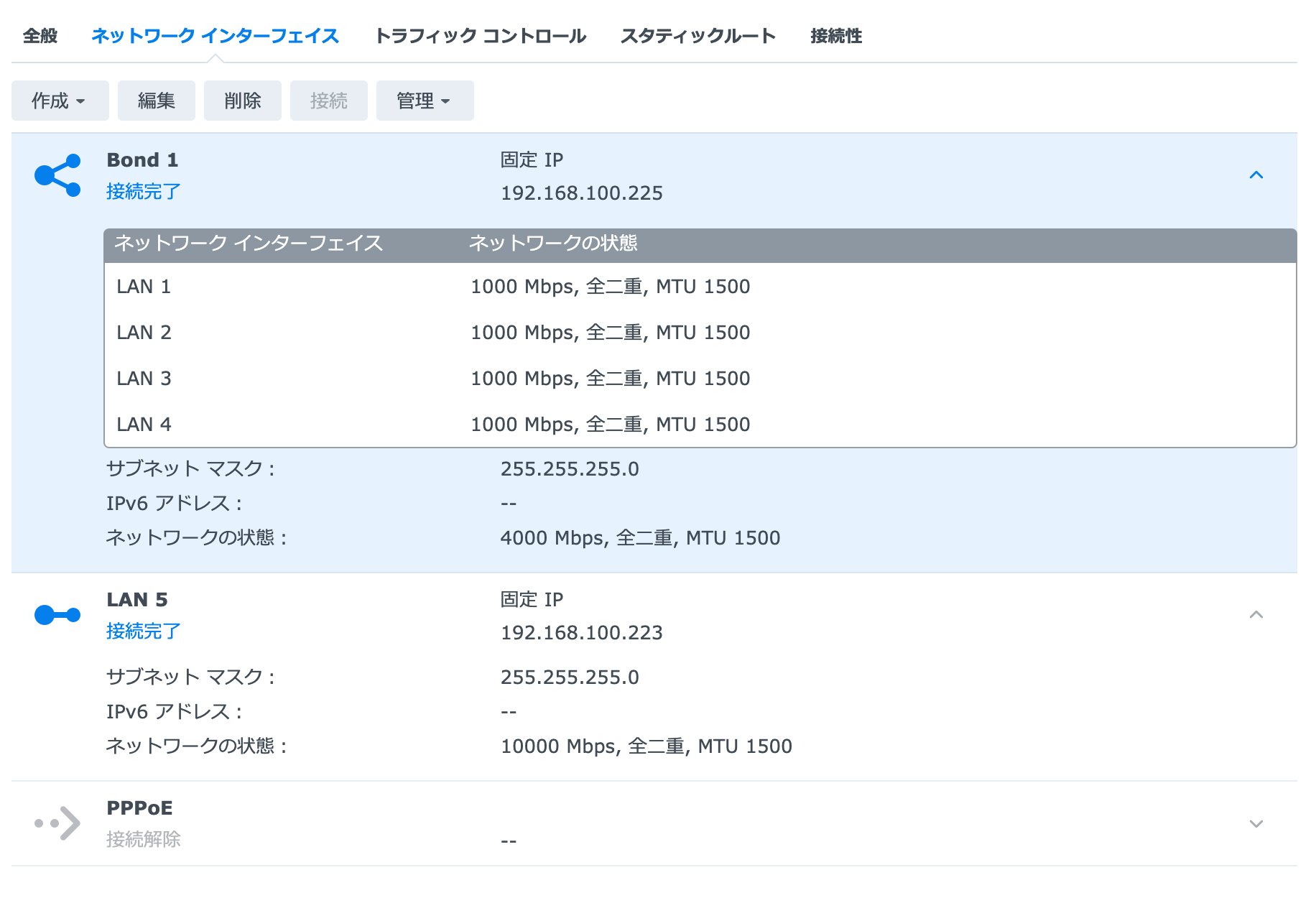 10G NICを持っているクライアントはLAN 5のIPで通信し、その他の無線を含むクライアントはBond 1のIPで通信するような想定です。