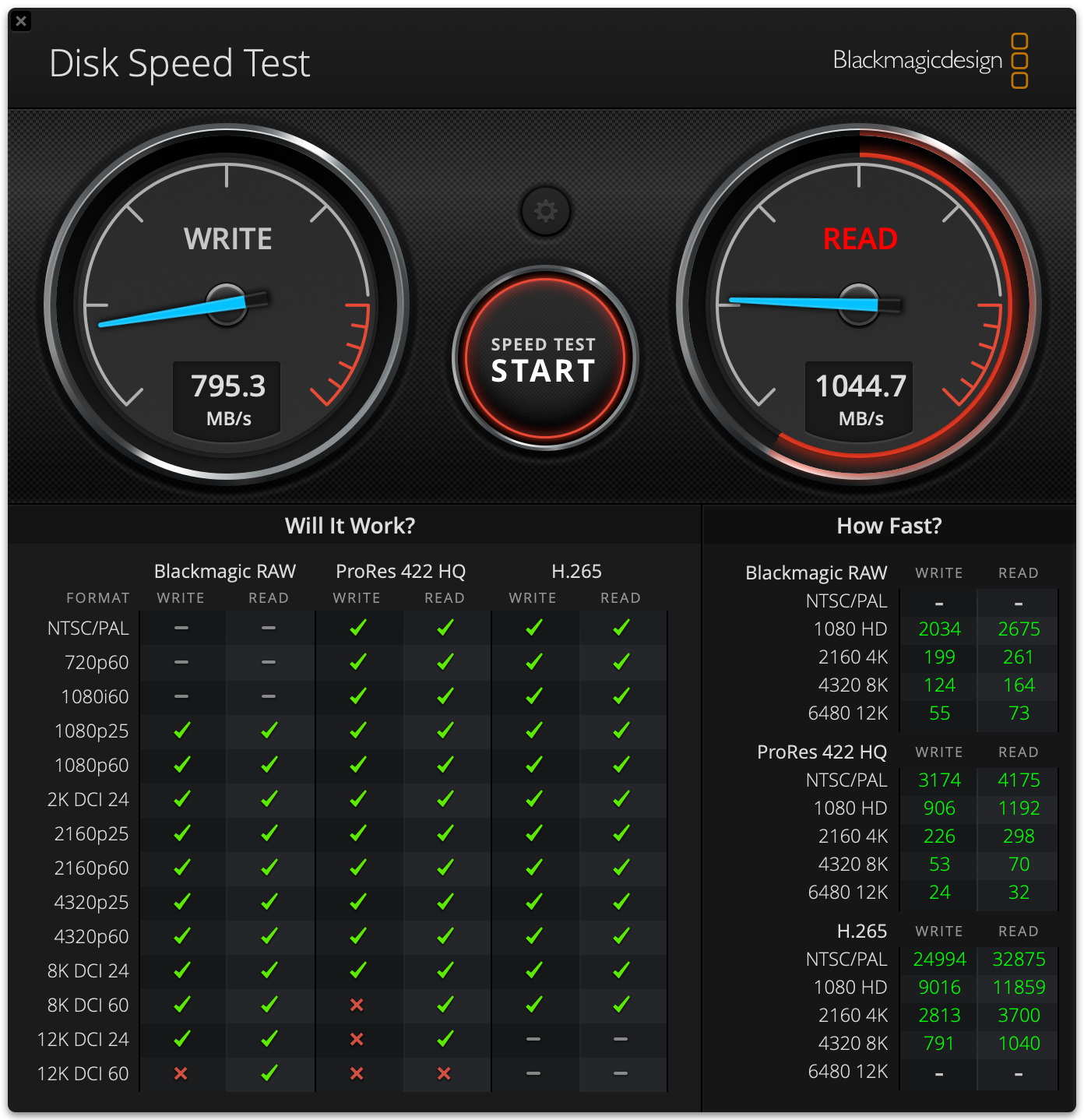 10GでリンクしているmacからNASへの速度をBlackmagic Disk Speed Testで計測します。