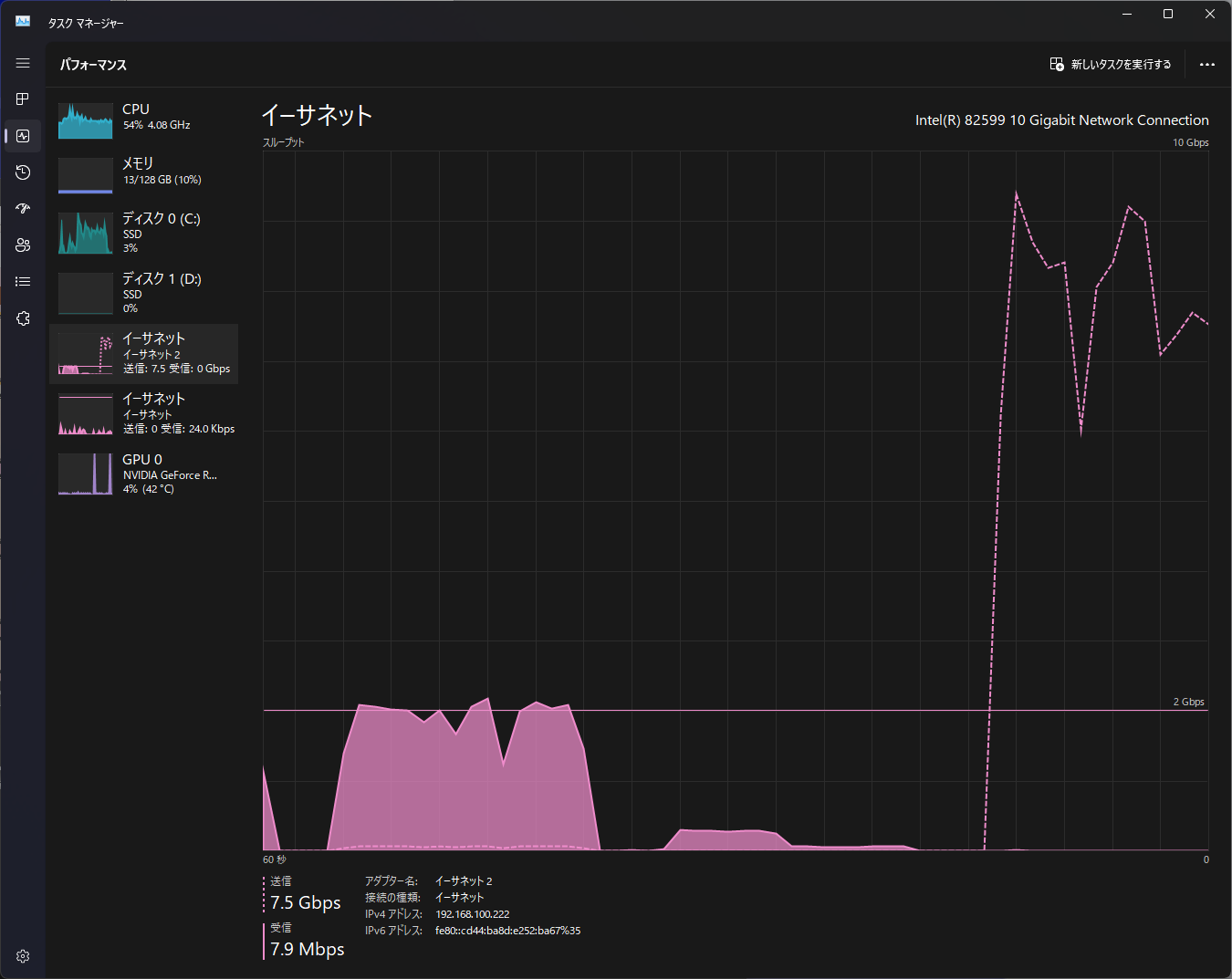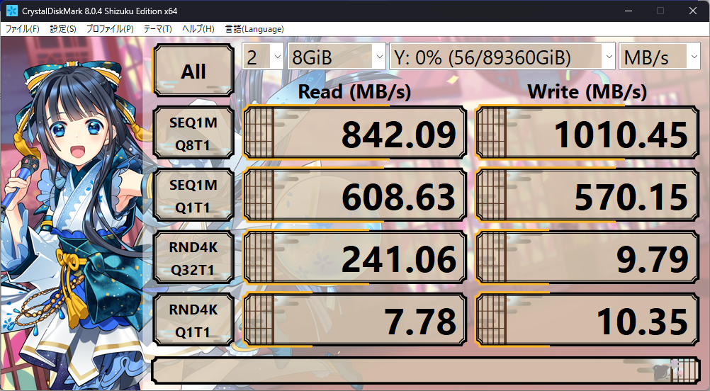 中々良い速度がでました、HDDなので多くは期待していなかったのですが読込は8Gbpsほど出ています。書込はキャッシュが聞かないのですがそれでも6Gbpsほど出ていて優秀です。