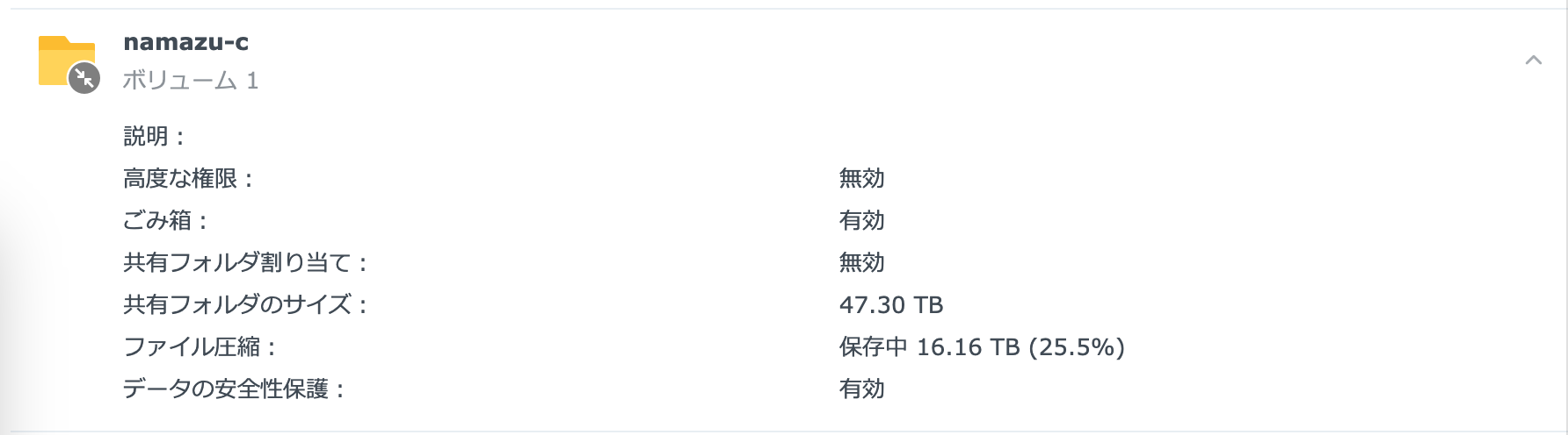スクショのように重複排除と圧縮で容量が25%、16TB以上も削減されました。 重複排除機能で同じファイルであれば複製しても容量を食わないため、素材フォルダーと作業フォルダーそれぞれに同じデータを置いても容量が2倍にならないのは大変助かります。