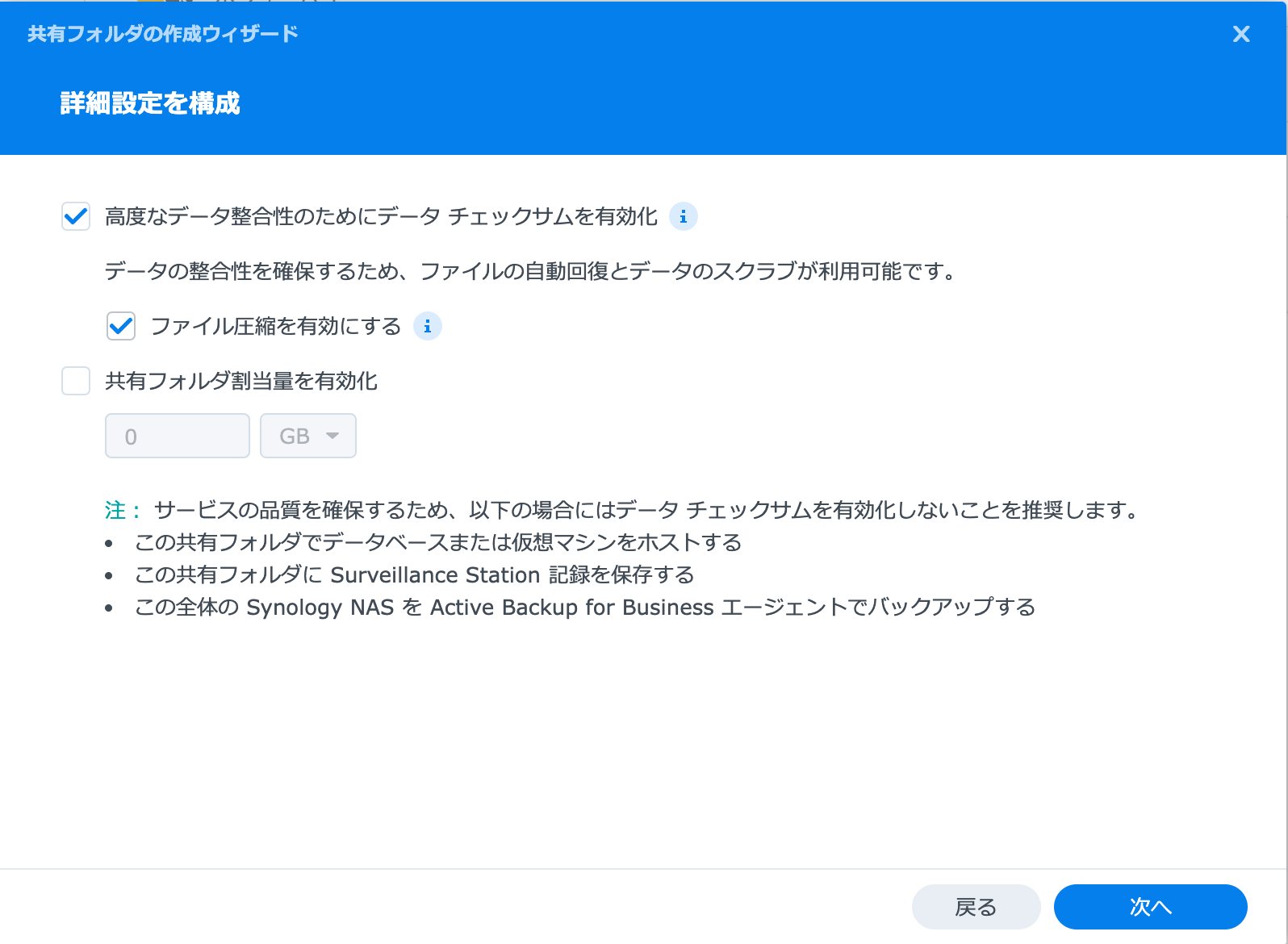 まず共有フォルダーを作成する際に「高度なチェックサム」の有効化を忘れないようにしないと後から圧縮設定ができません。