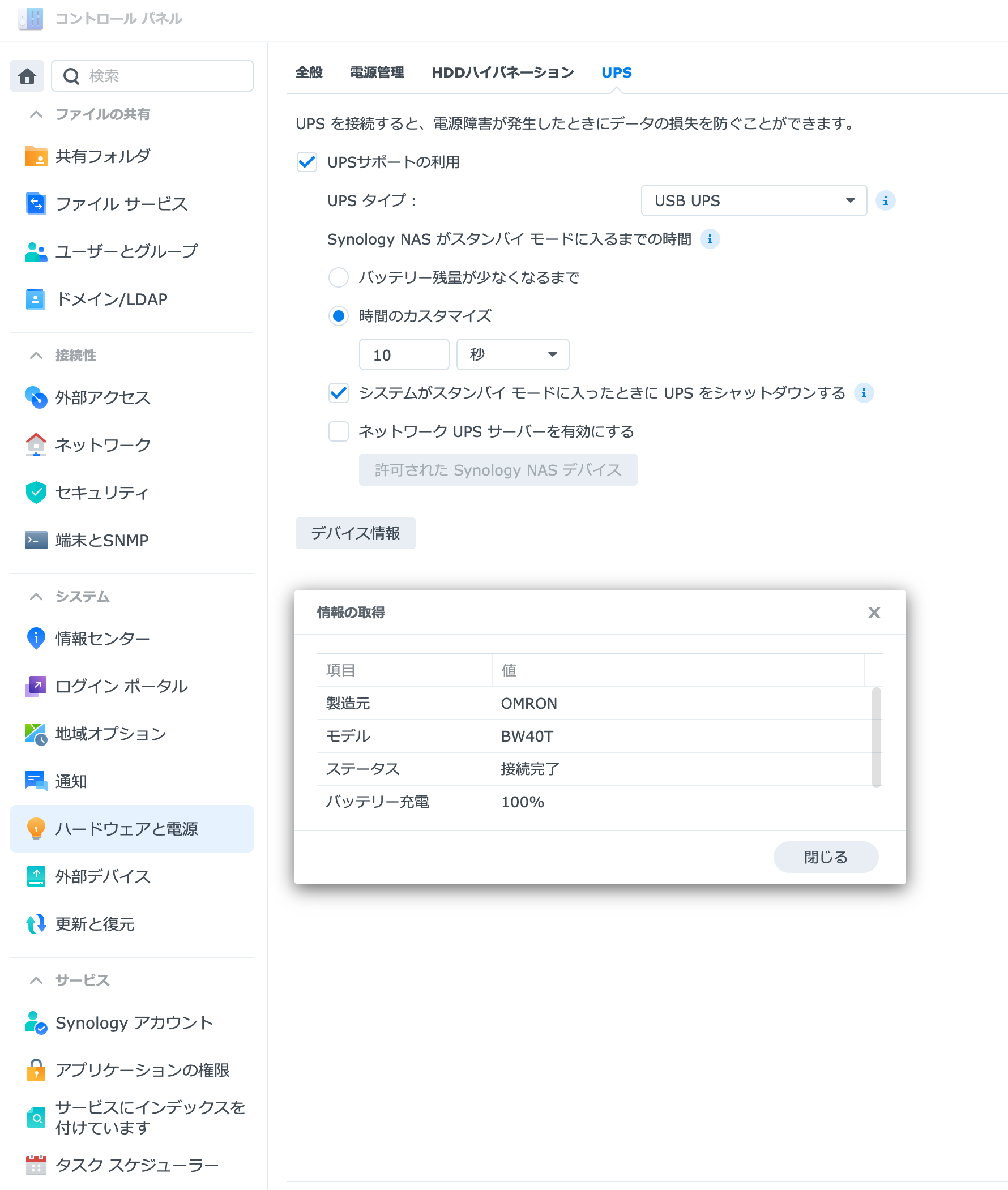 NAS側設定の「ハードウェアと電源」のUPS項目で「UPSサポートの利用」を有効化します。 今回は電源断検知後10秒でシャットダウン処理に入るようにしました。