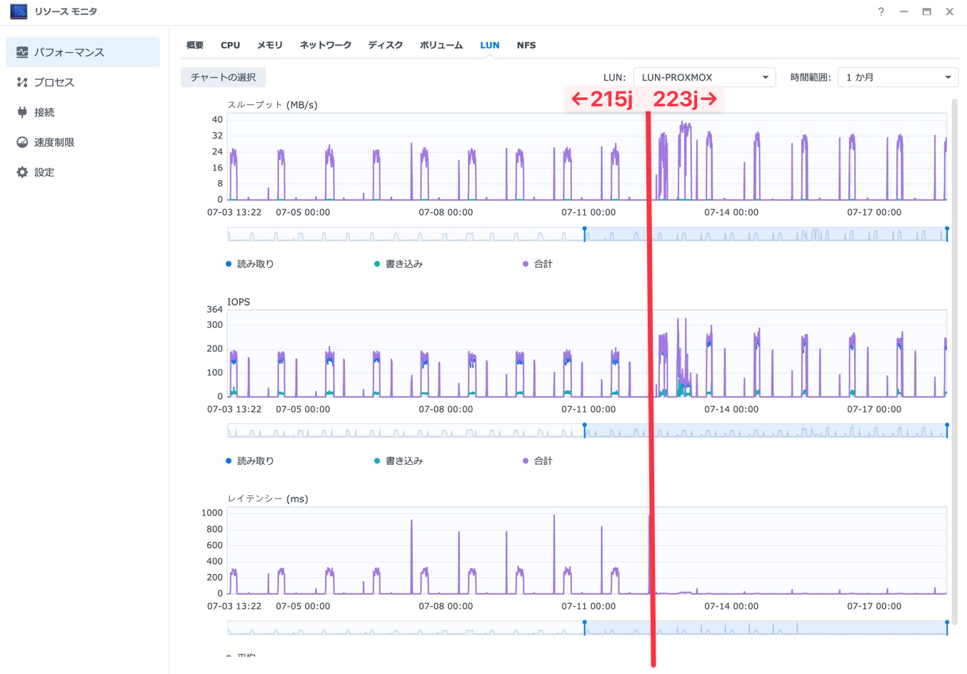 転送速度でみると24MBps程度だった速度が32MBps程度になりました。LUNのレイテンシーもほぼ無くなり、満足できる数値です。