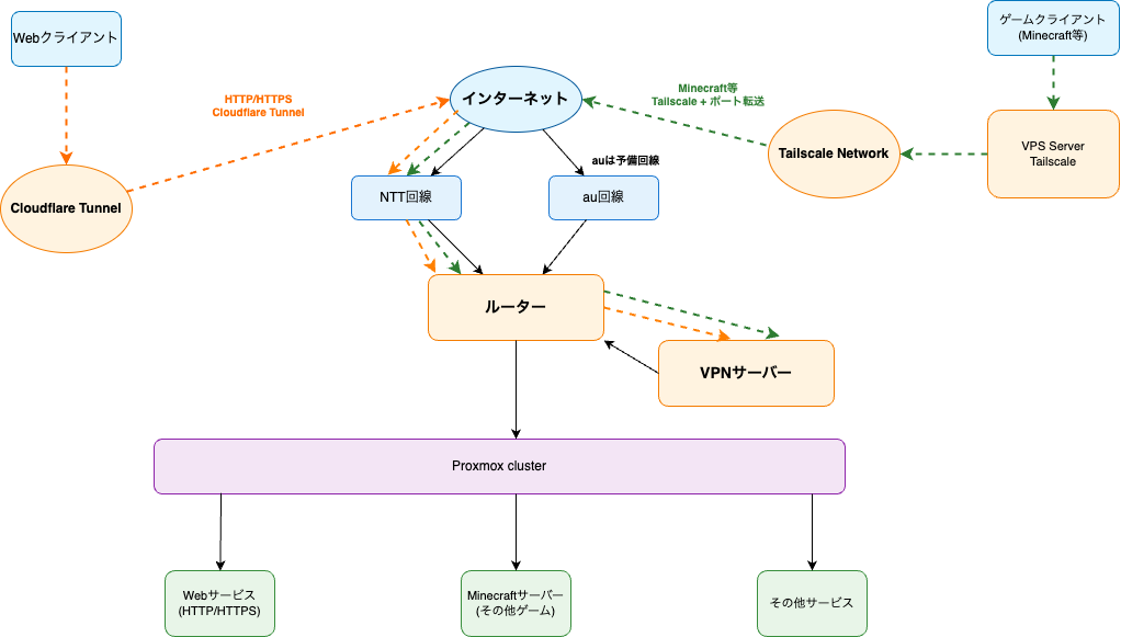 そのため、HTTP/HTTPSの通信にはCloudflare Tunnelを利用しています。それ以外の通信や宅内のSubnetへのアクセスにはTailscaleを利用しています。
