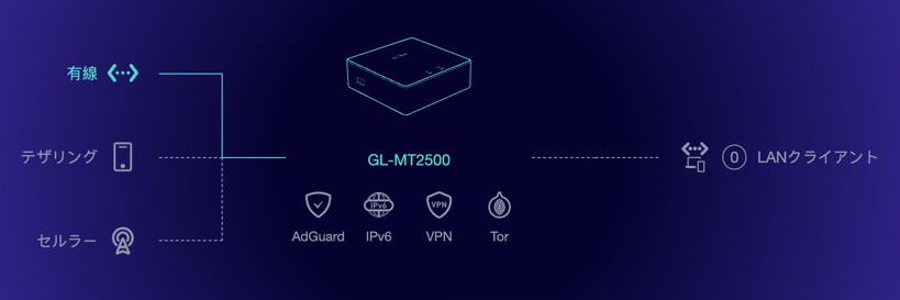 GL.iNetの製品はOpenWrtをベースに構築された小型トラベルルーターが多いです。外出先のホテルなどで接続するとルーター側でVPNを通して端末に通信を提供できることが売りです。