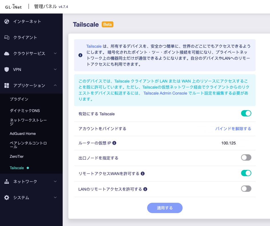 TailscaleはGL.iNetではデフォルトでサポートされています。そのため、Web GUI画面でポチポチ有効化するだけで利用可能です。